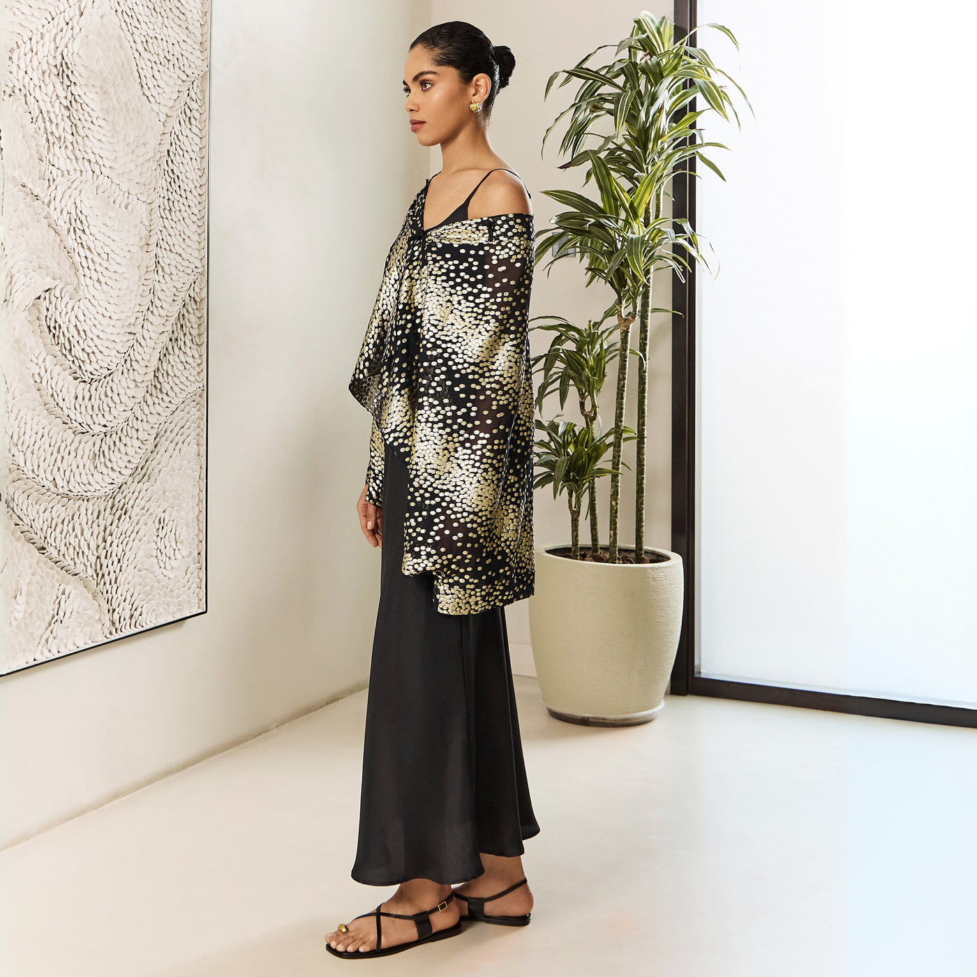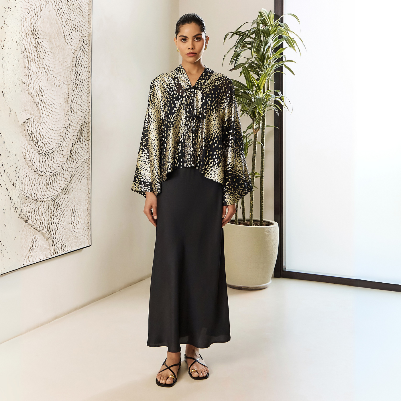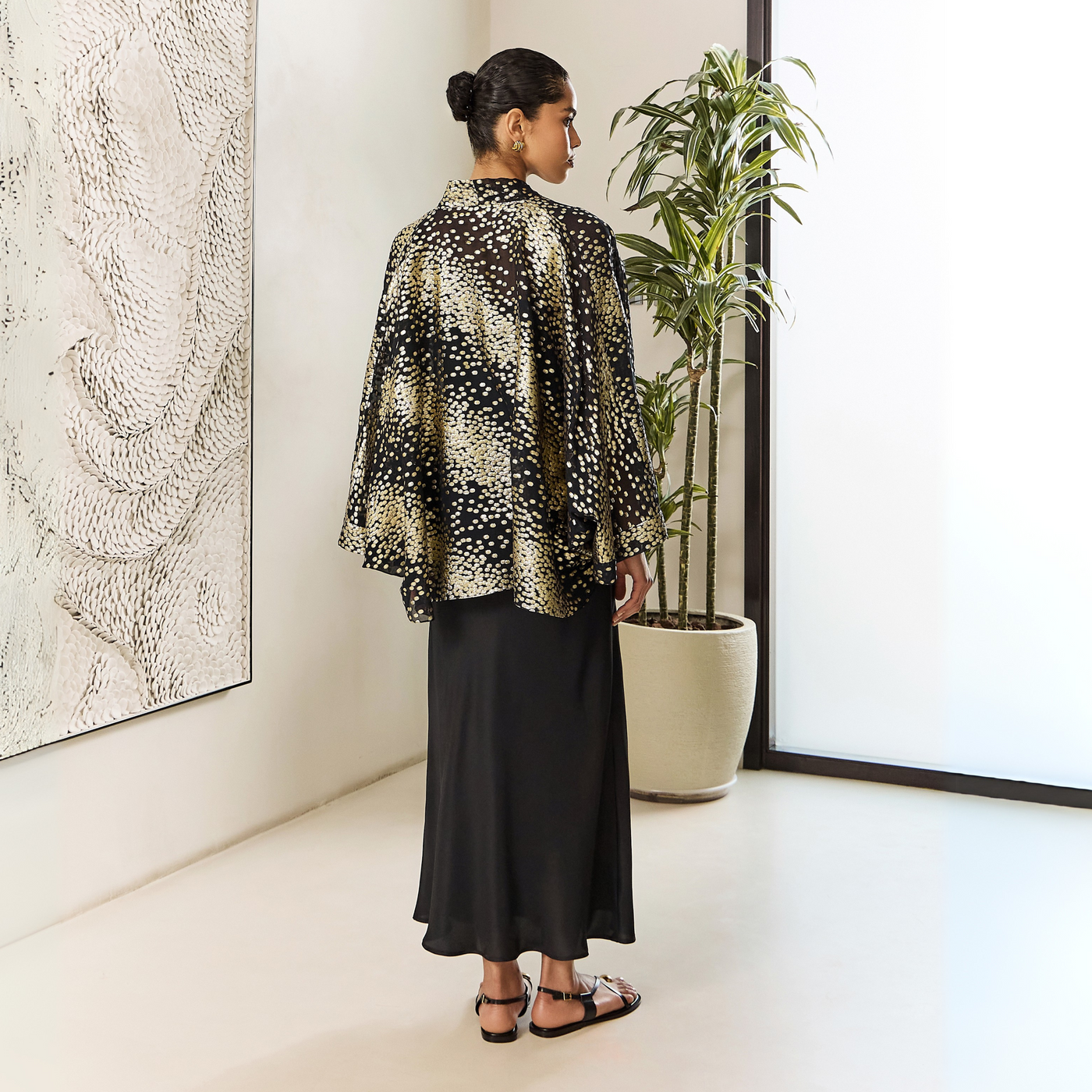 Elegant 100% silk slip dress paired with a flowing chiffon cape adorned with shimmering zari accents.