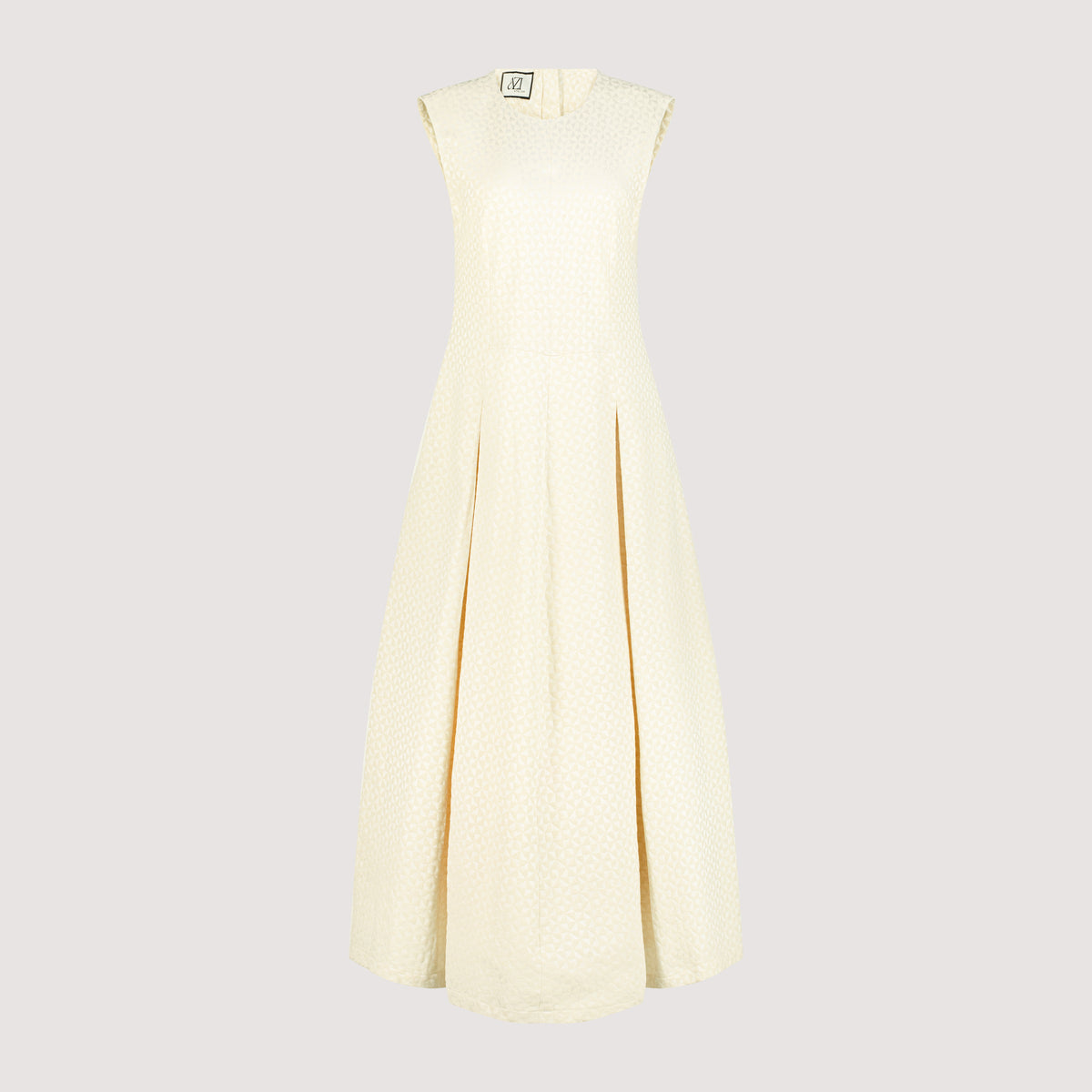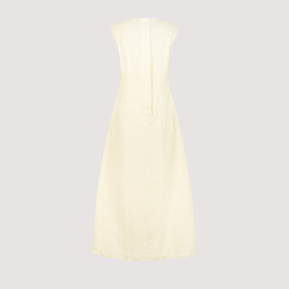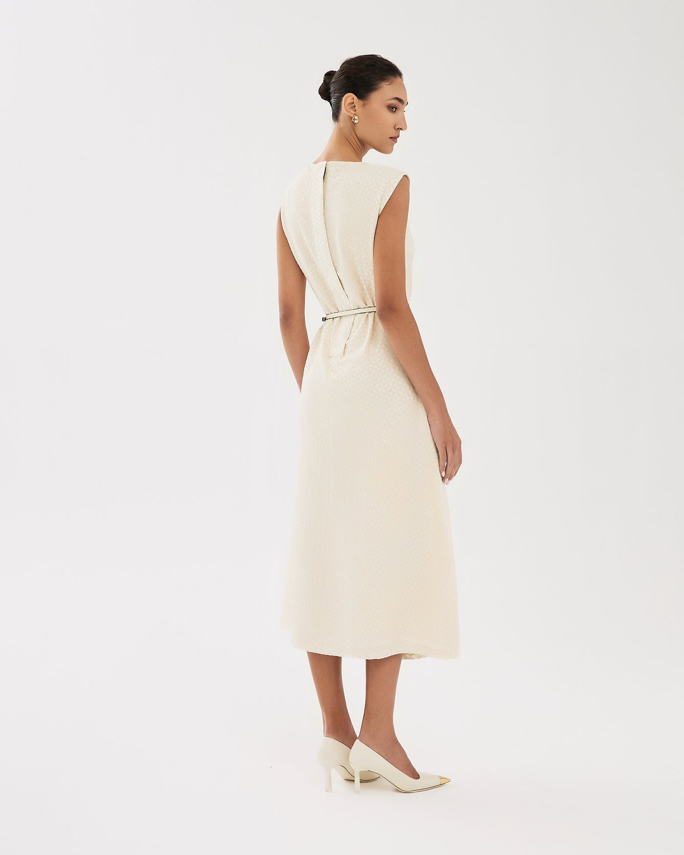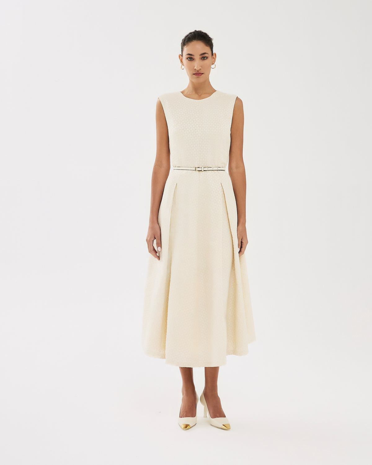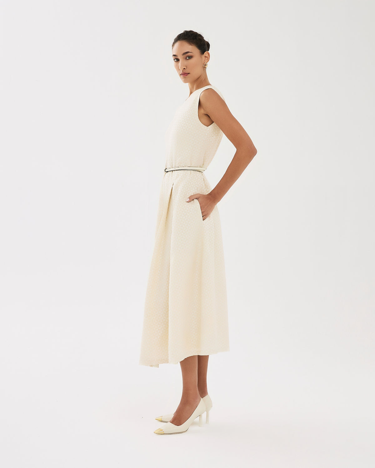A cream or ivory A-line cotton silk dress with a fitted bodice, flared midi skirt, sleeveless design, and high neckline exudes minimalistic elegance.