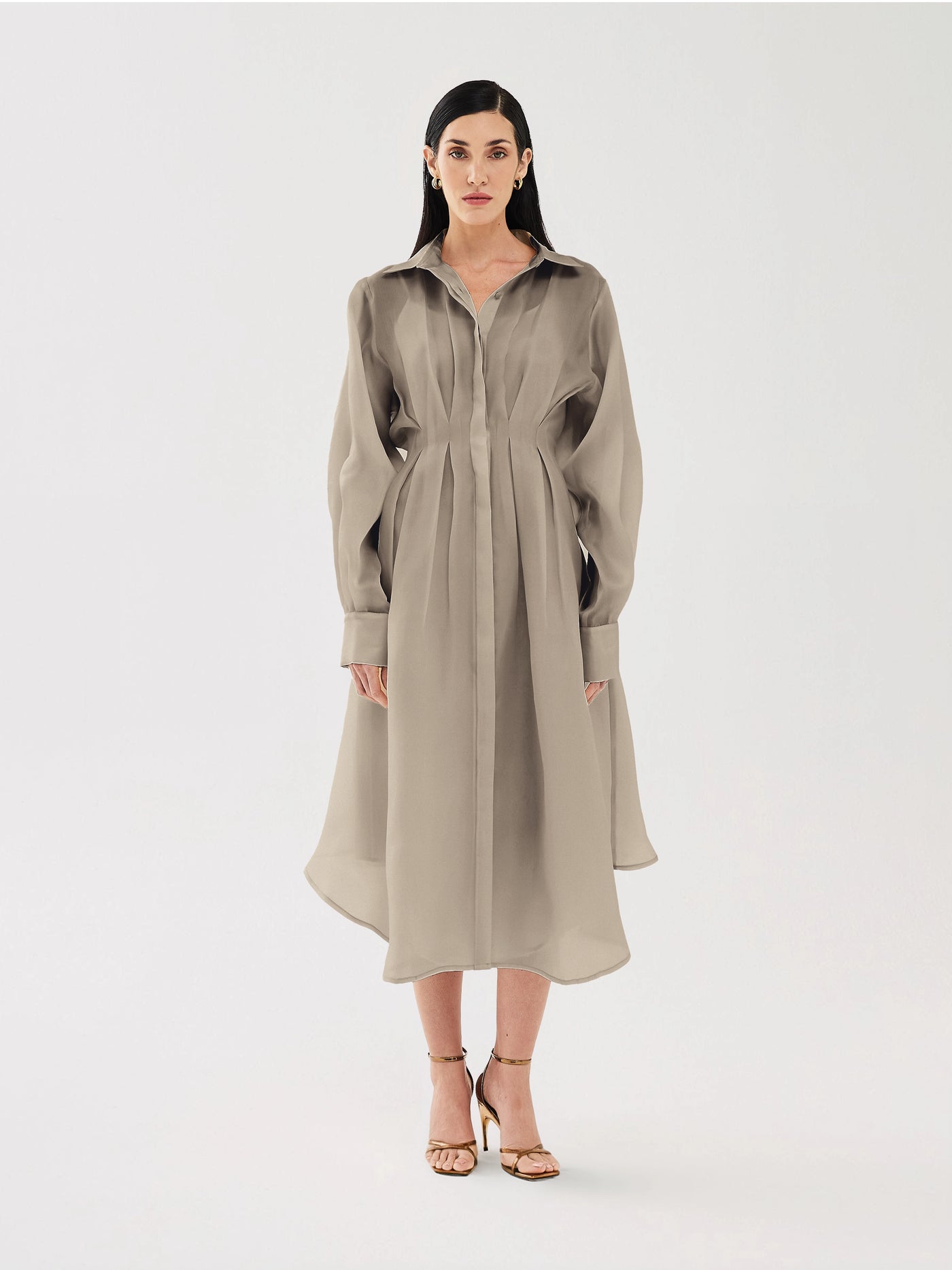 A soft taupe two-piece organza dress with a flowing A-line fit, voluminous sleeves, structured cuffs, a cinched waist, a high-low hem, an underslip, and side pockets for effortless sophistication.