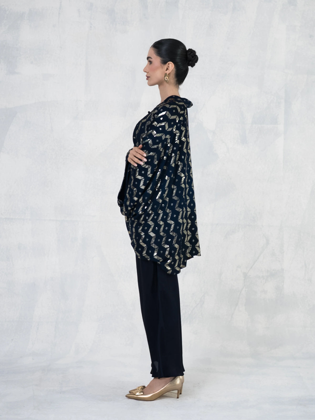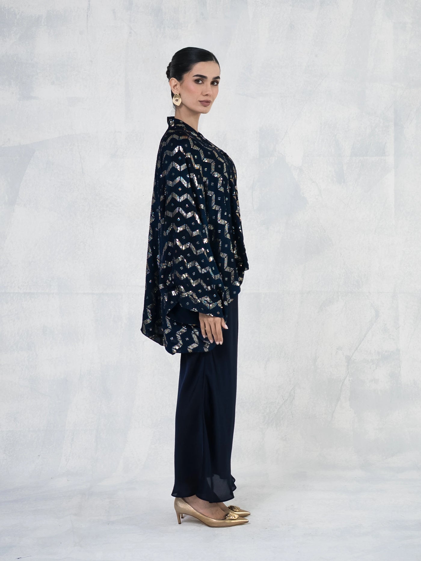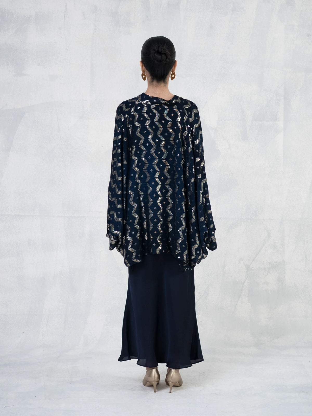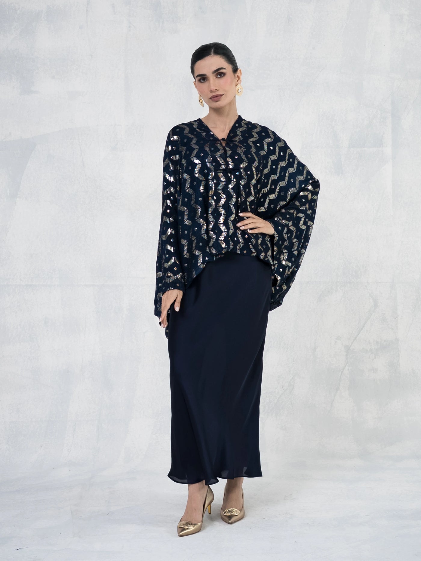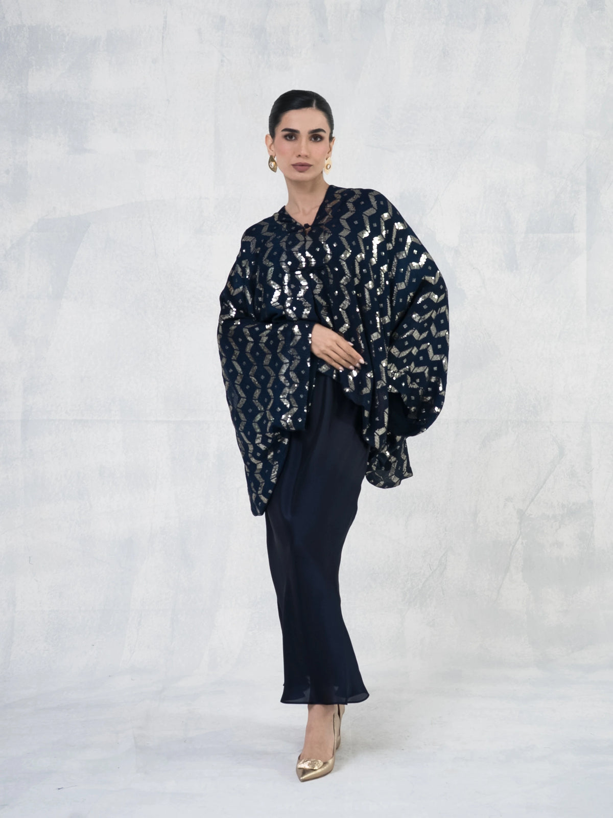 Elegant slip dress paired with a flowing chiffon cape adorned with& shimmering embroidery.