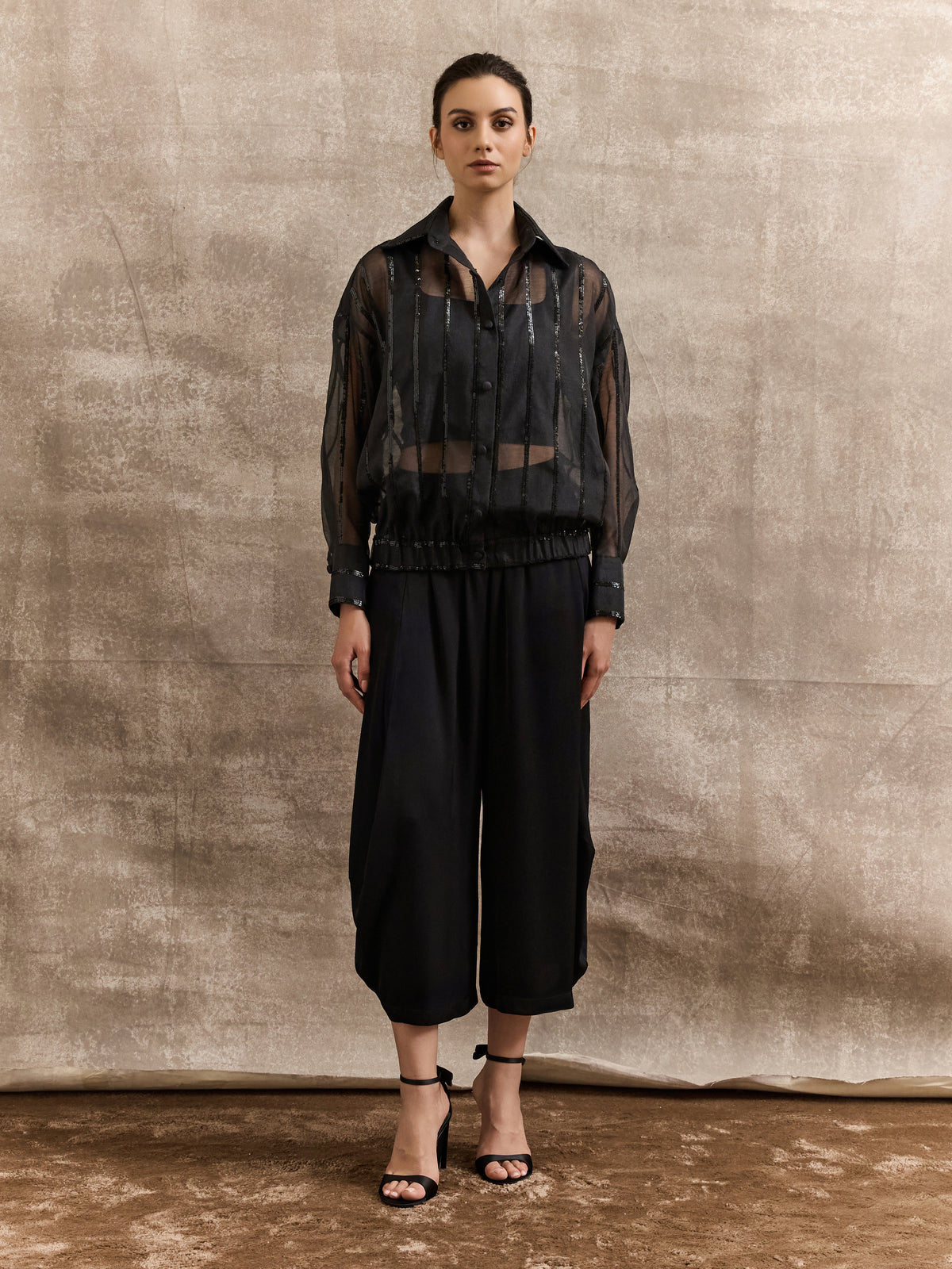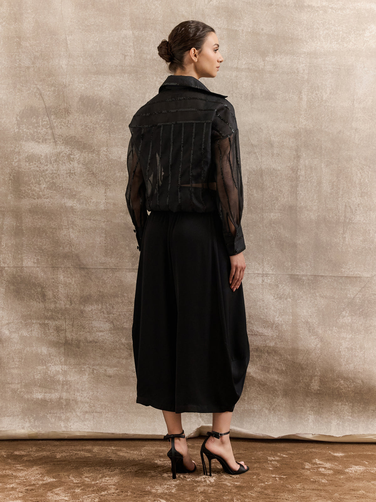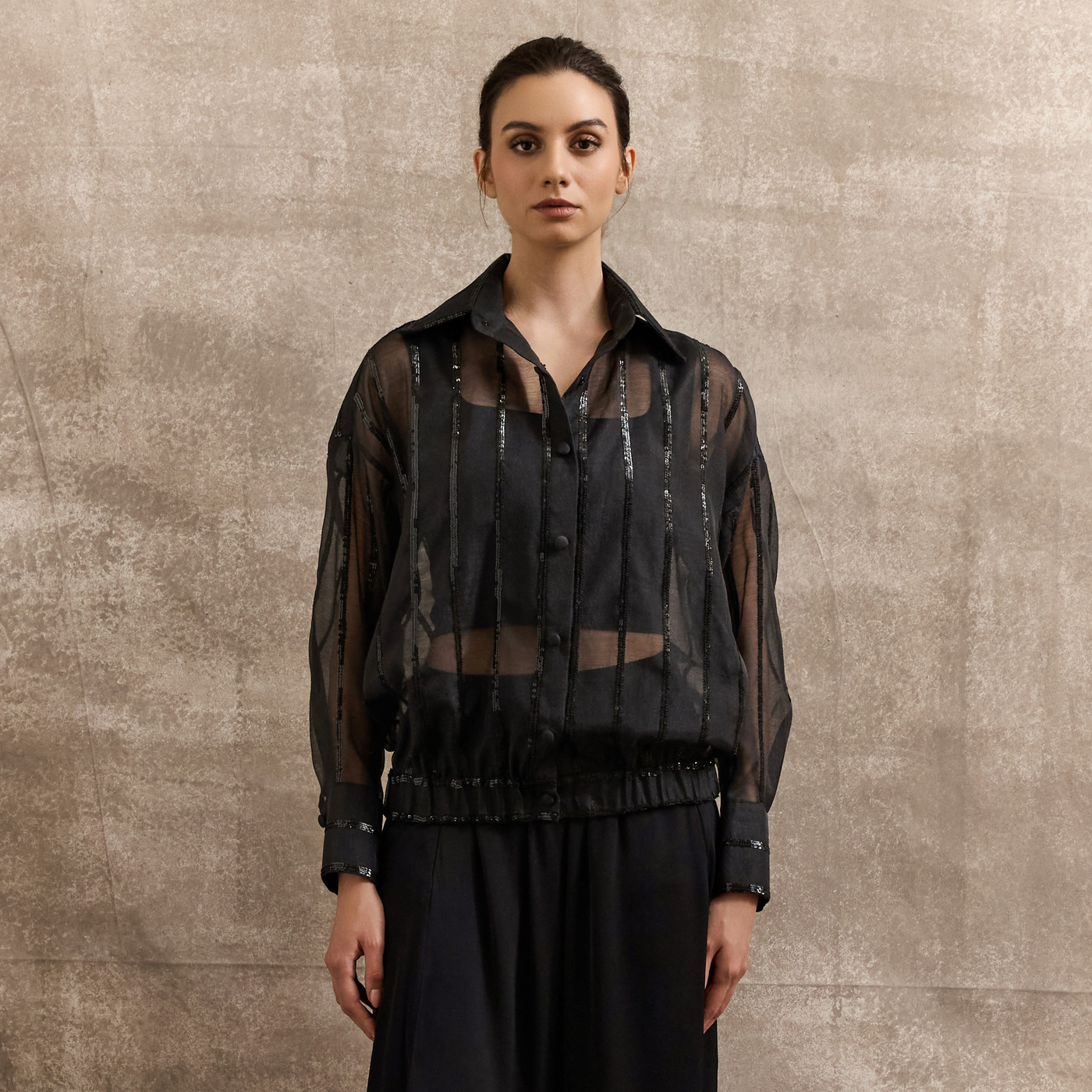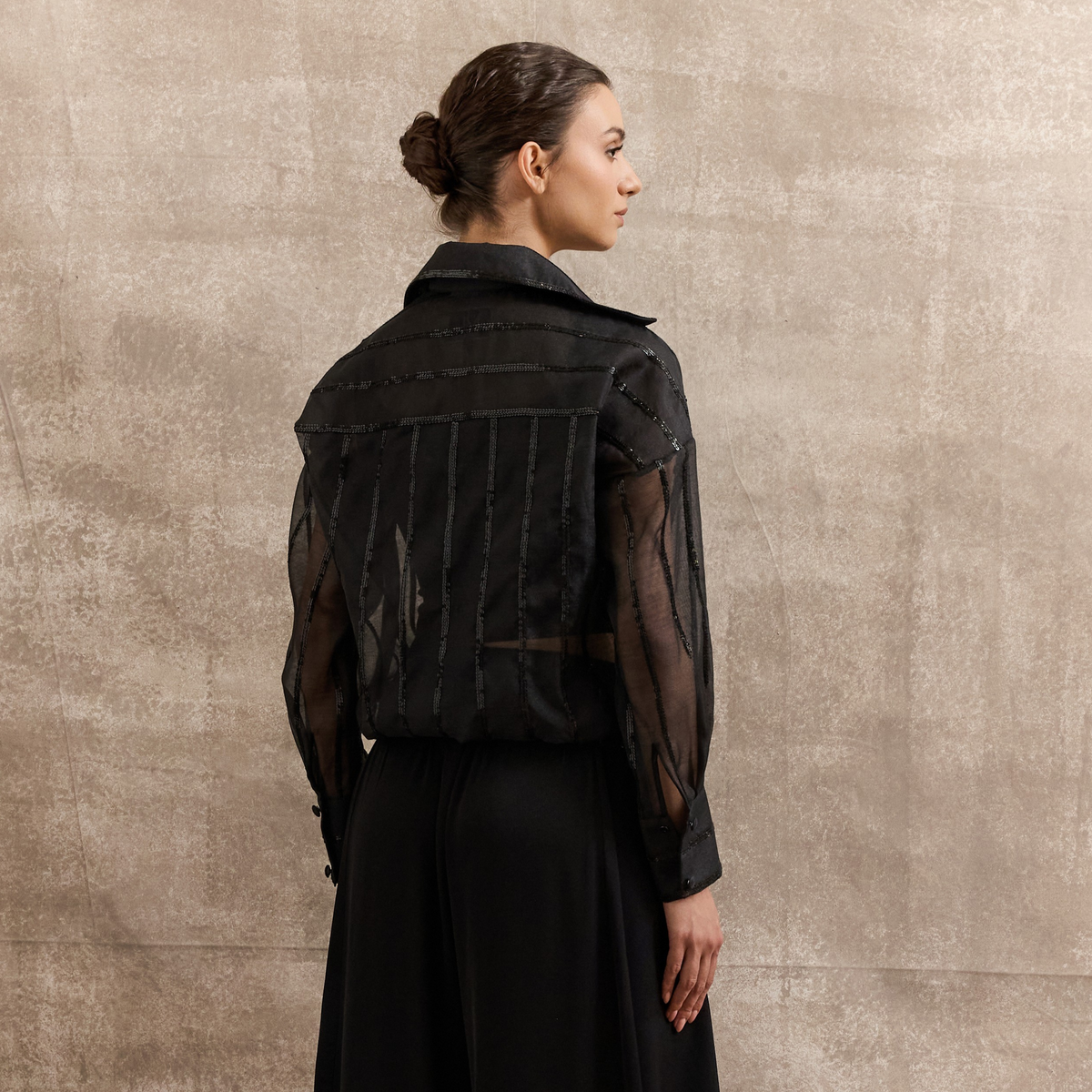 A sheer organza jacket embellished with delicate hand-beaded embroidery, adding shimmer and elegance.