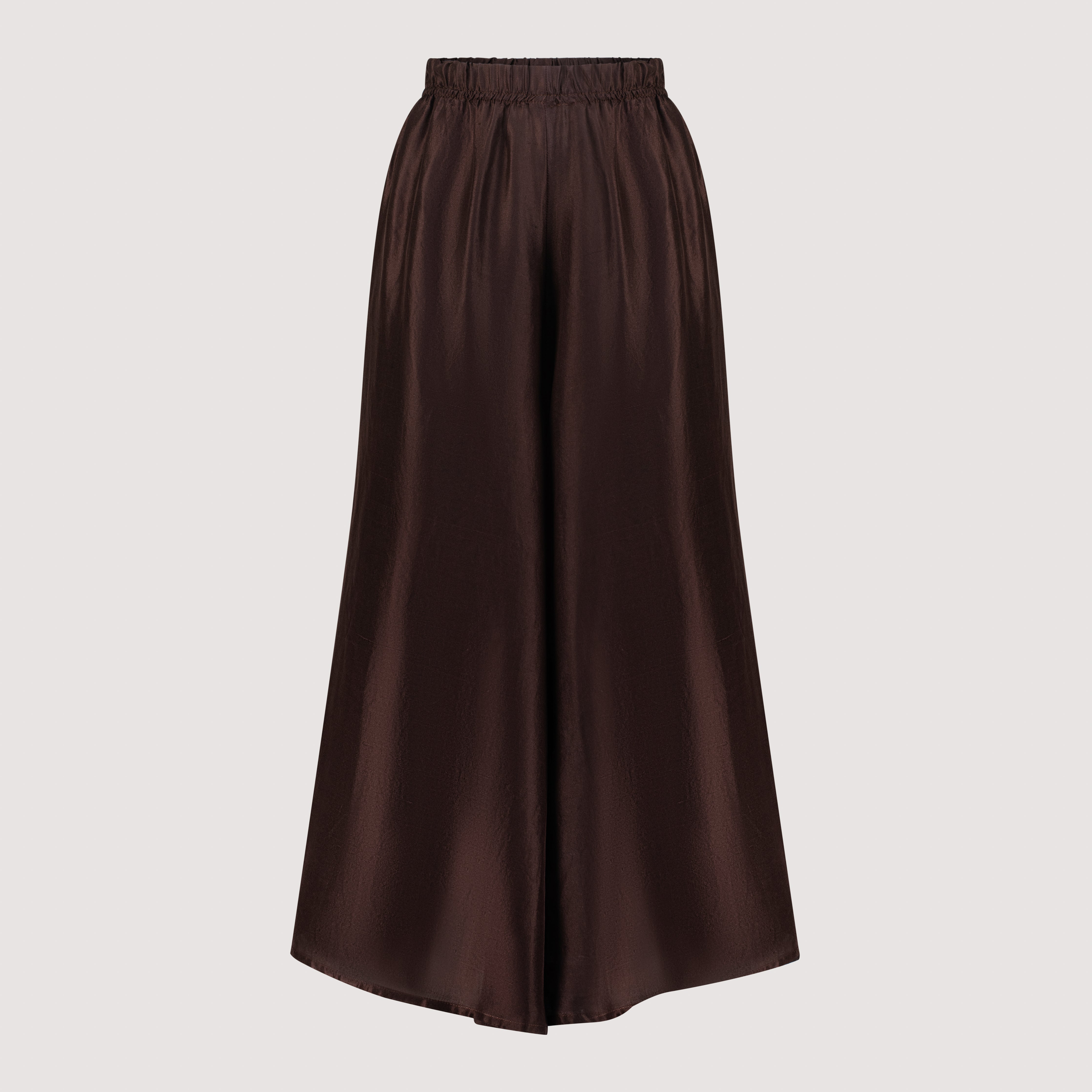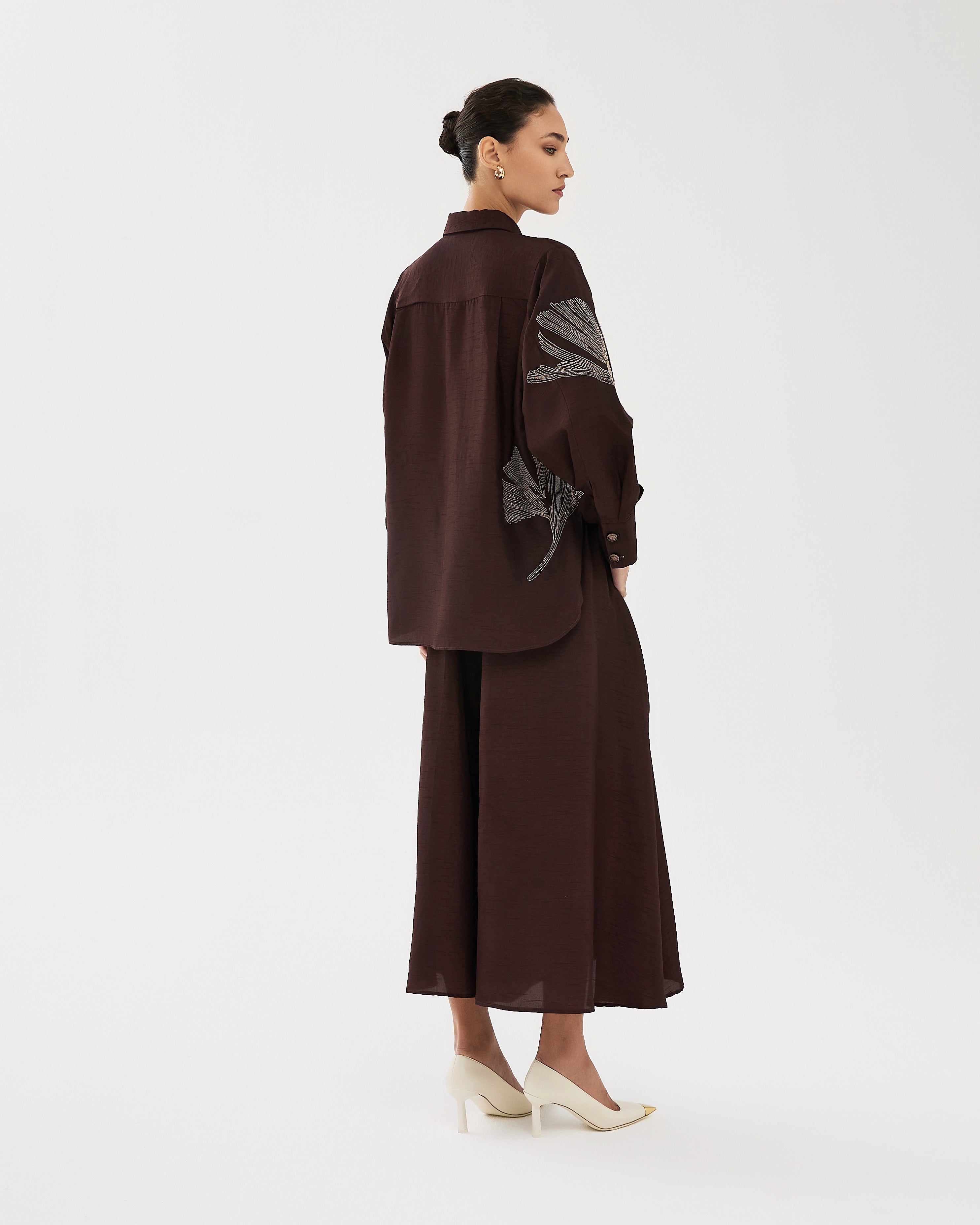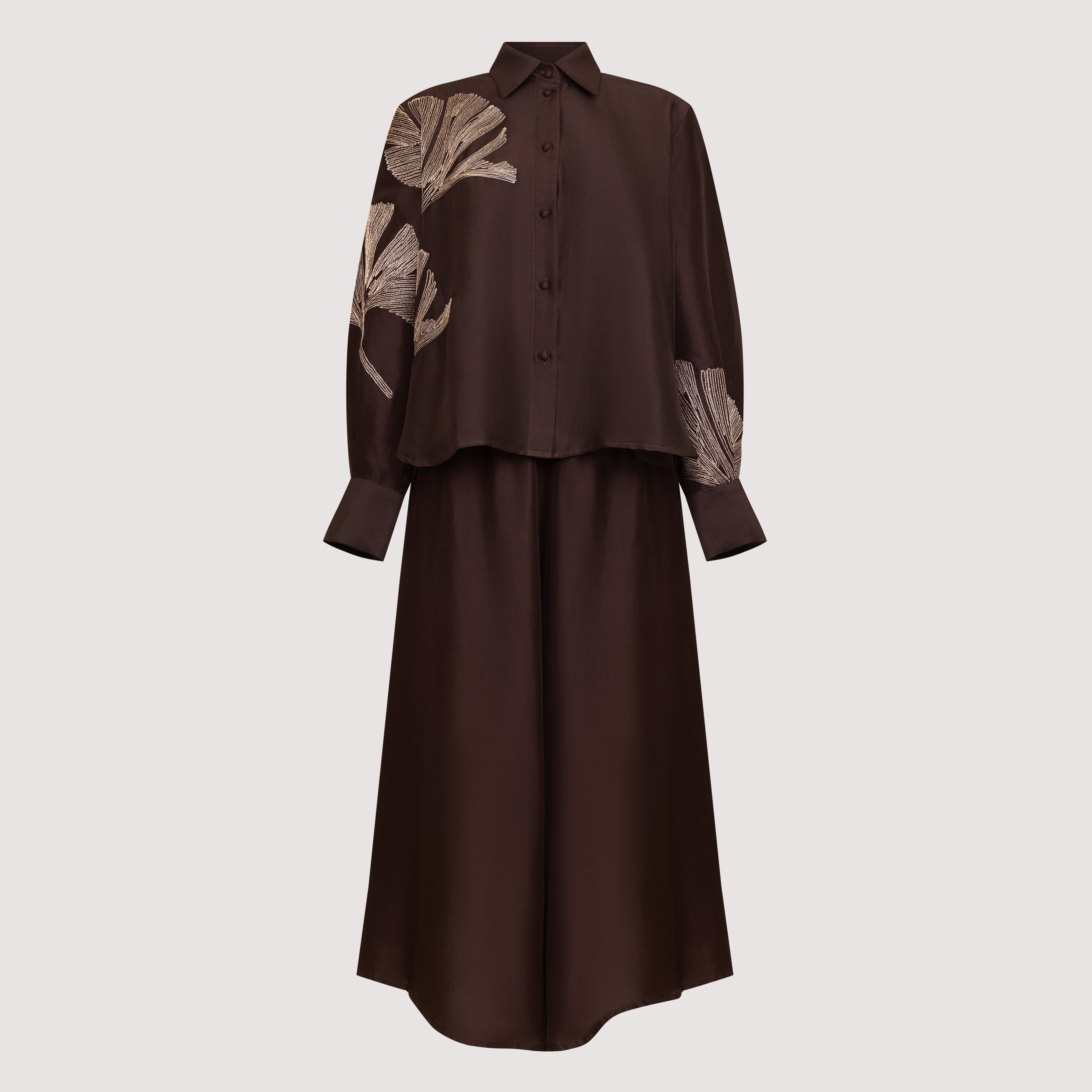 تتميز هذه المجموعة المصنوعة من الحرير السيريسين باللون البني الشوكولاتي ببلوزة مصممة بأزرار مع تطريز نباتي وملاءمة مريحة، مع بنطلون متوسط الطول على شكل حرف A من أجل الأناقة والراحة.