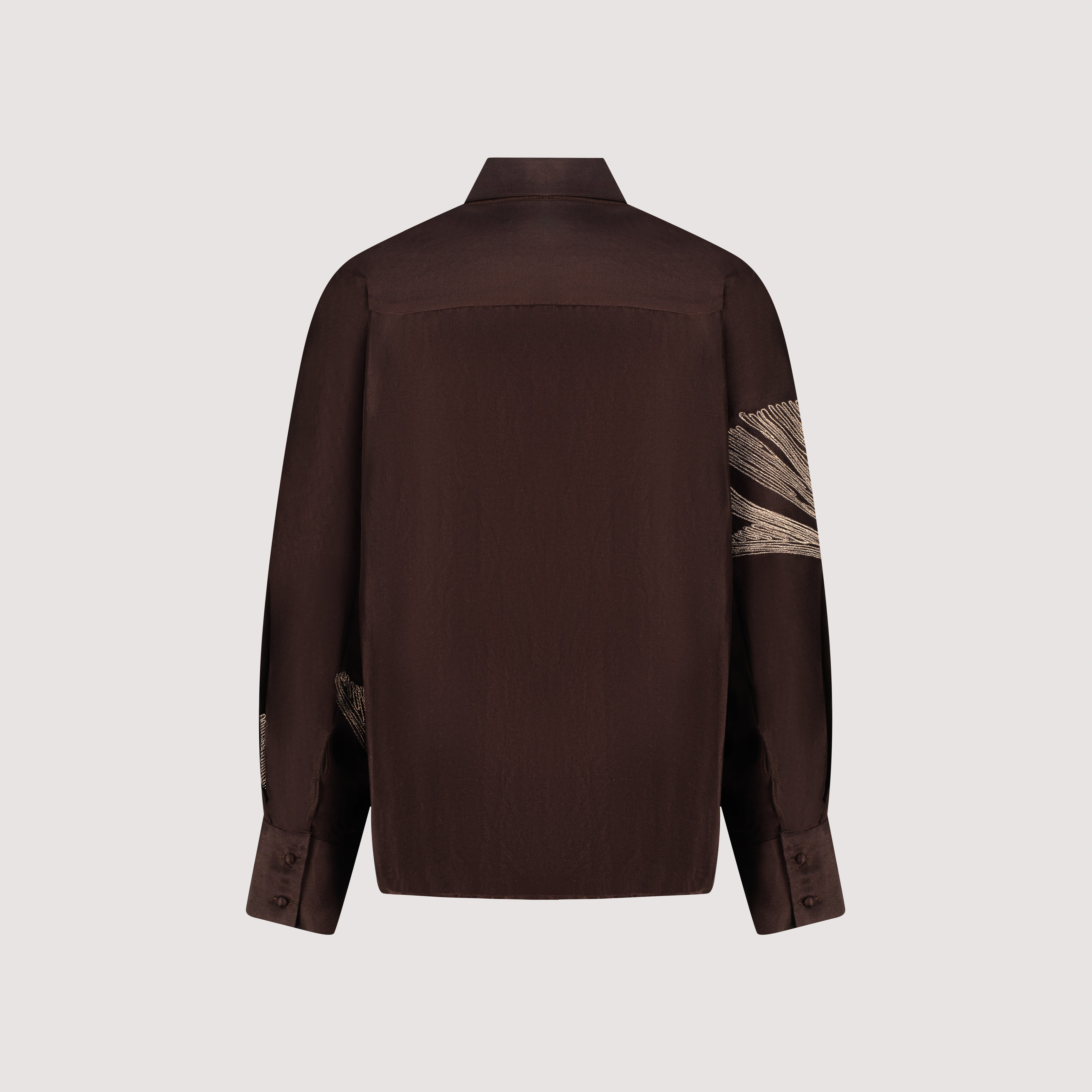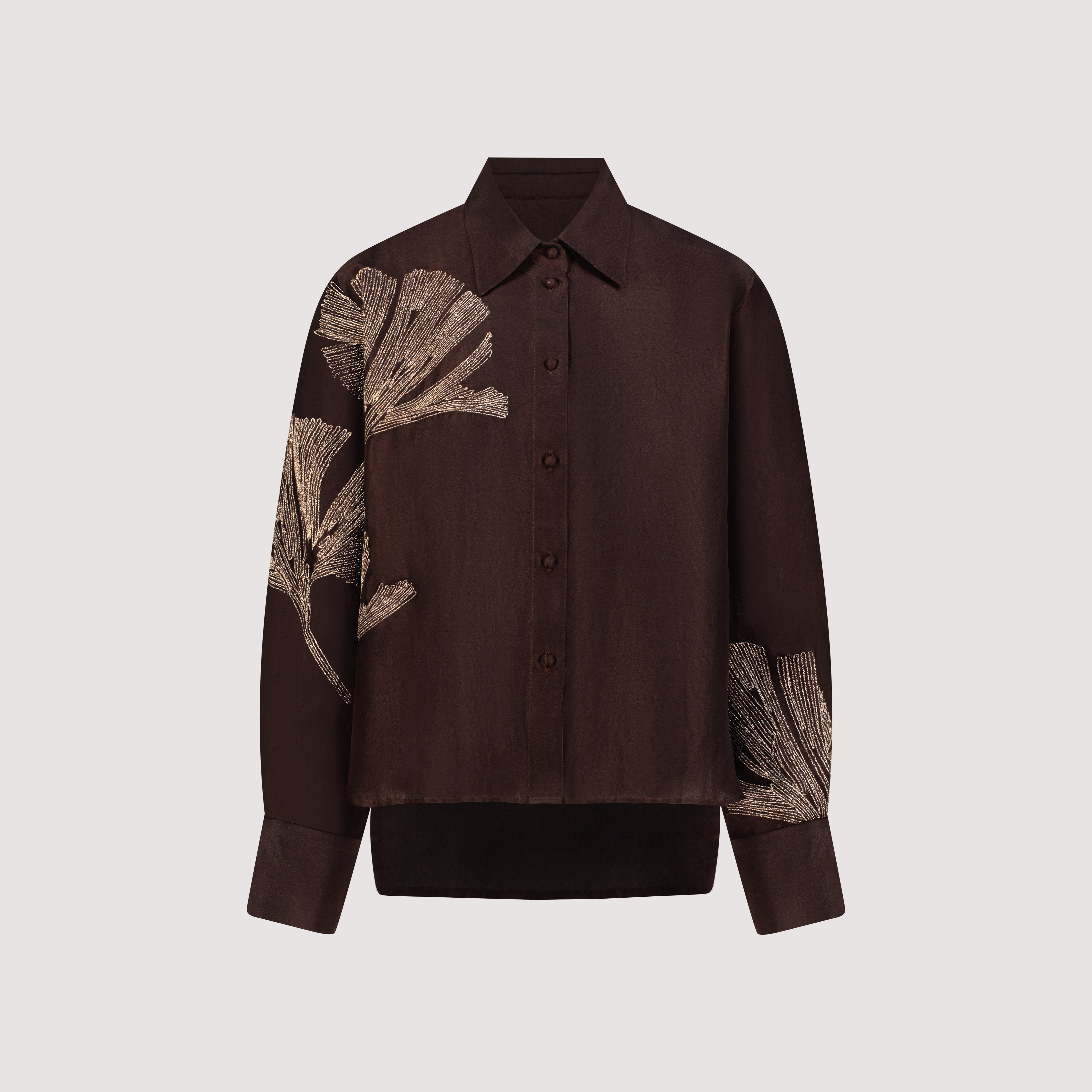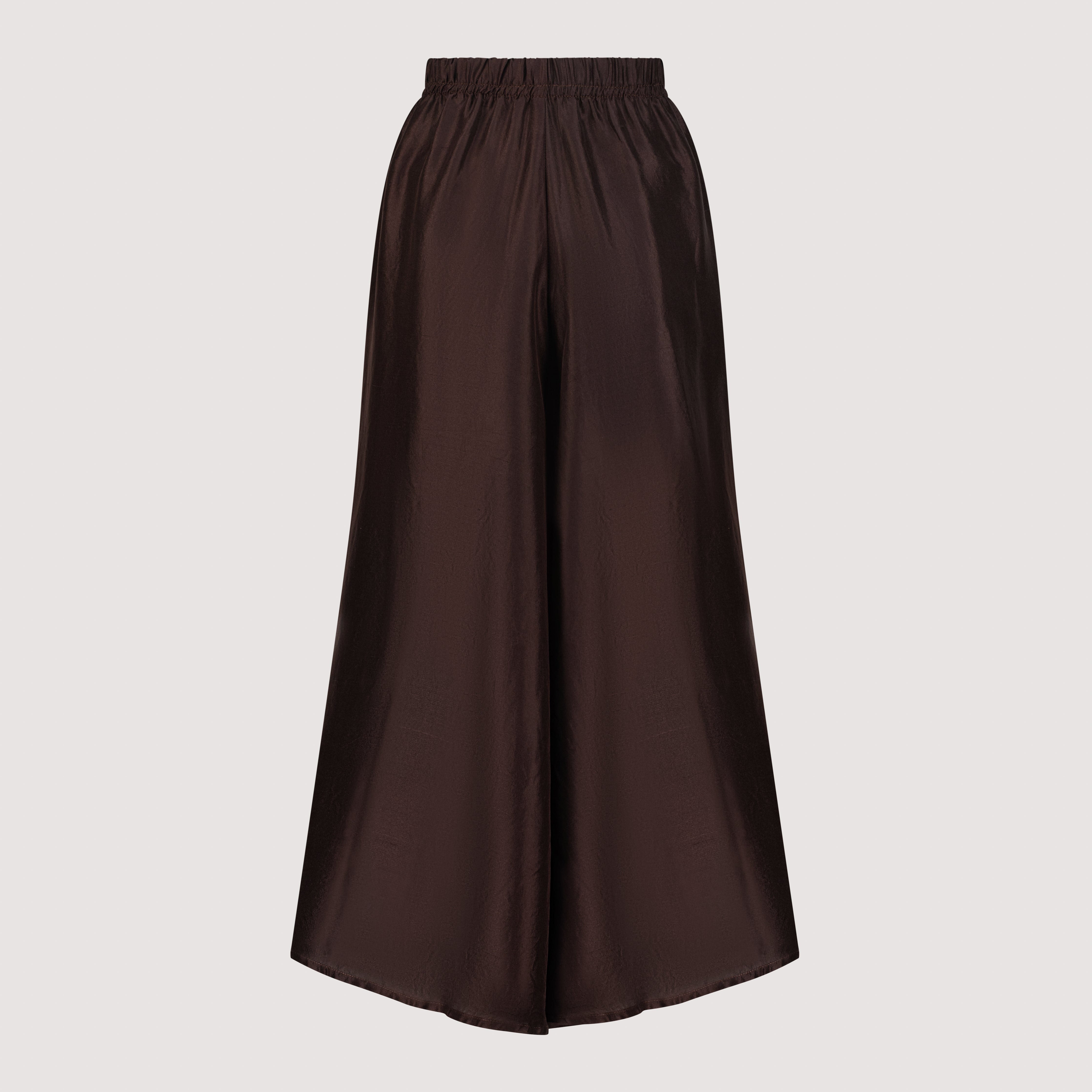 تتميز هذه المجموعة المصنوعة من الحرير السيريسين باللون البني الشوكولاتي ببلوزة مصممة بأزرار مع تطريز نباتي وملاءمة مريحة، مع بنطلون متوسط الطول على شكل حرف A من أجل الأناقة والراحة.