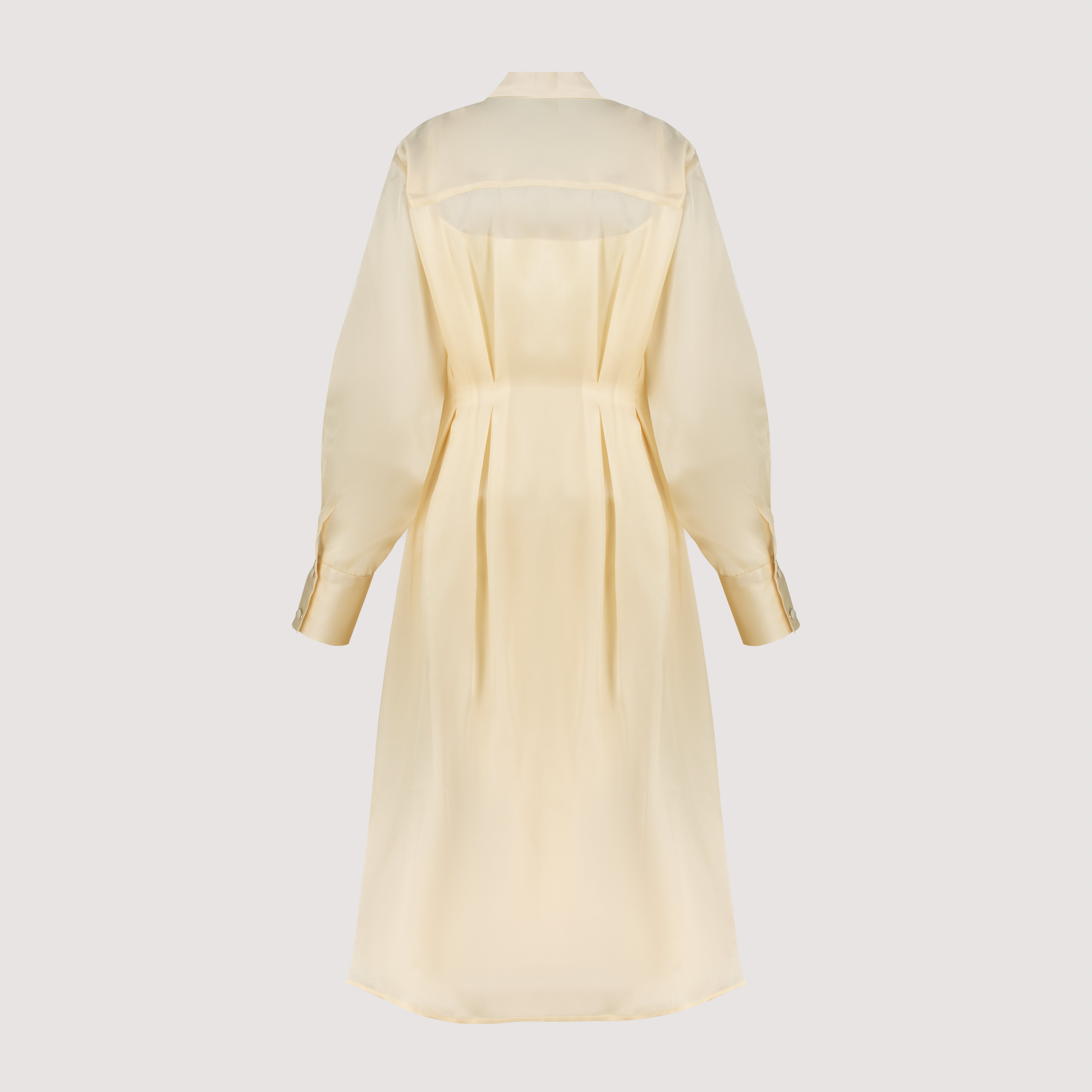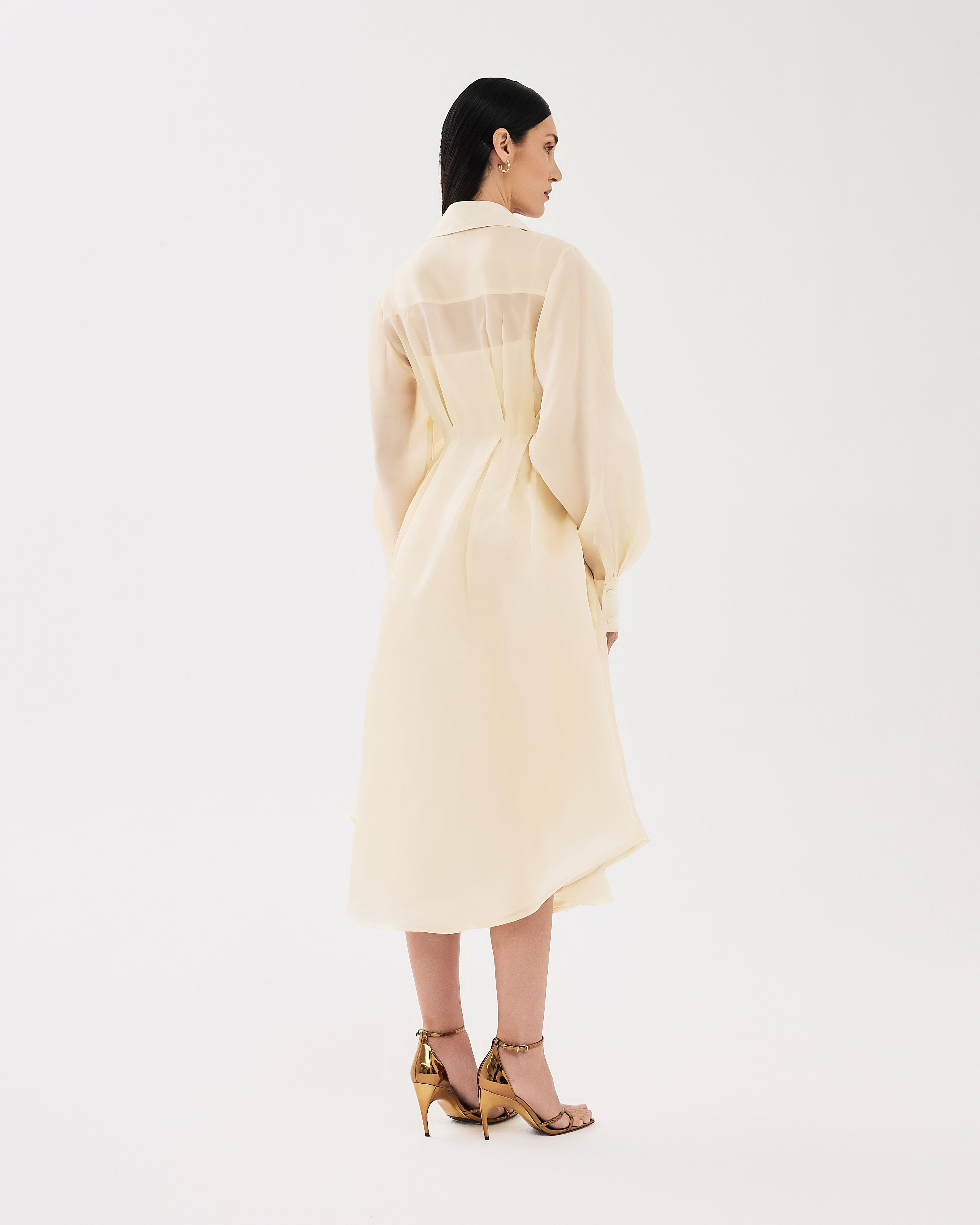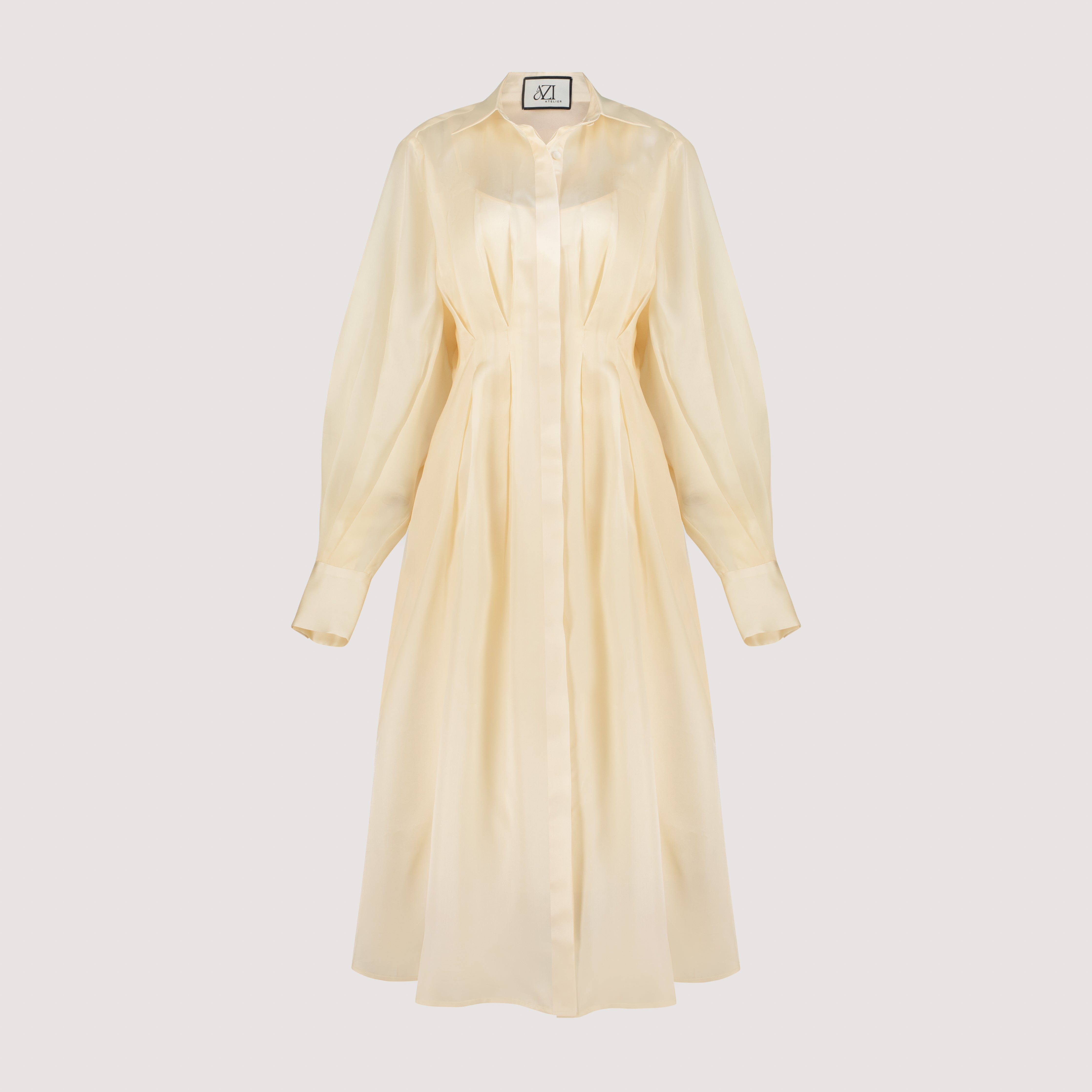 فستان ناعم من قطعتين باللون البيج، يتميز بقصّة A متدفقة، وأكمام واسعة، وأساور منظمة، وخصر مشدود، وحاشية عالية ومنخفضة، وجزء سفلي، وجيوب جانبية لإضفاء لمسة من الأناقة دون عناء.