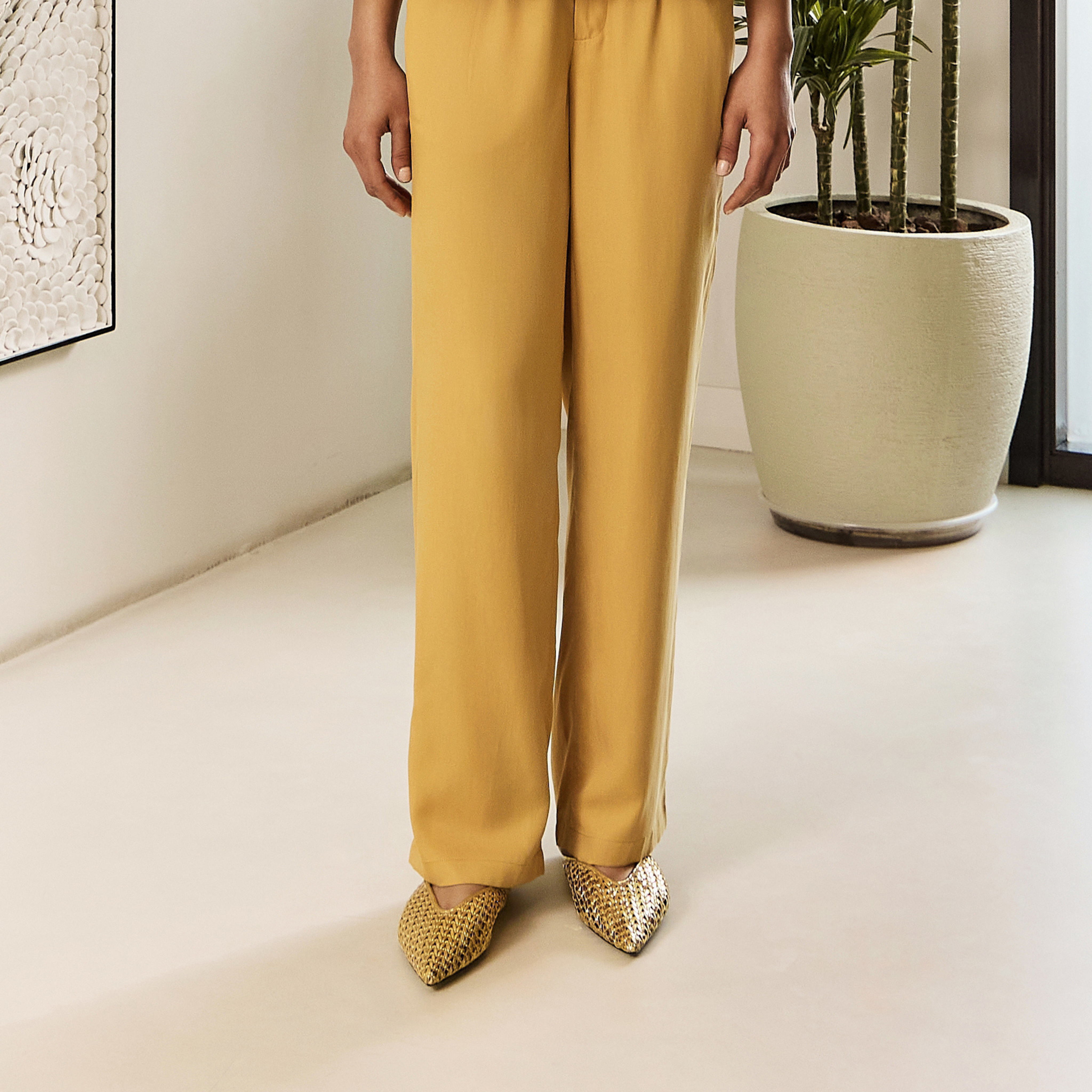 بنطلون مستقيم الساق مصنوع من قماش الحرير المائل، يوفر انسيابية وتشطيبًا راقيًا لإضفاء لمسة من الأناقة دون عناء.