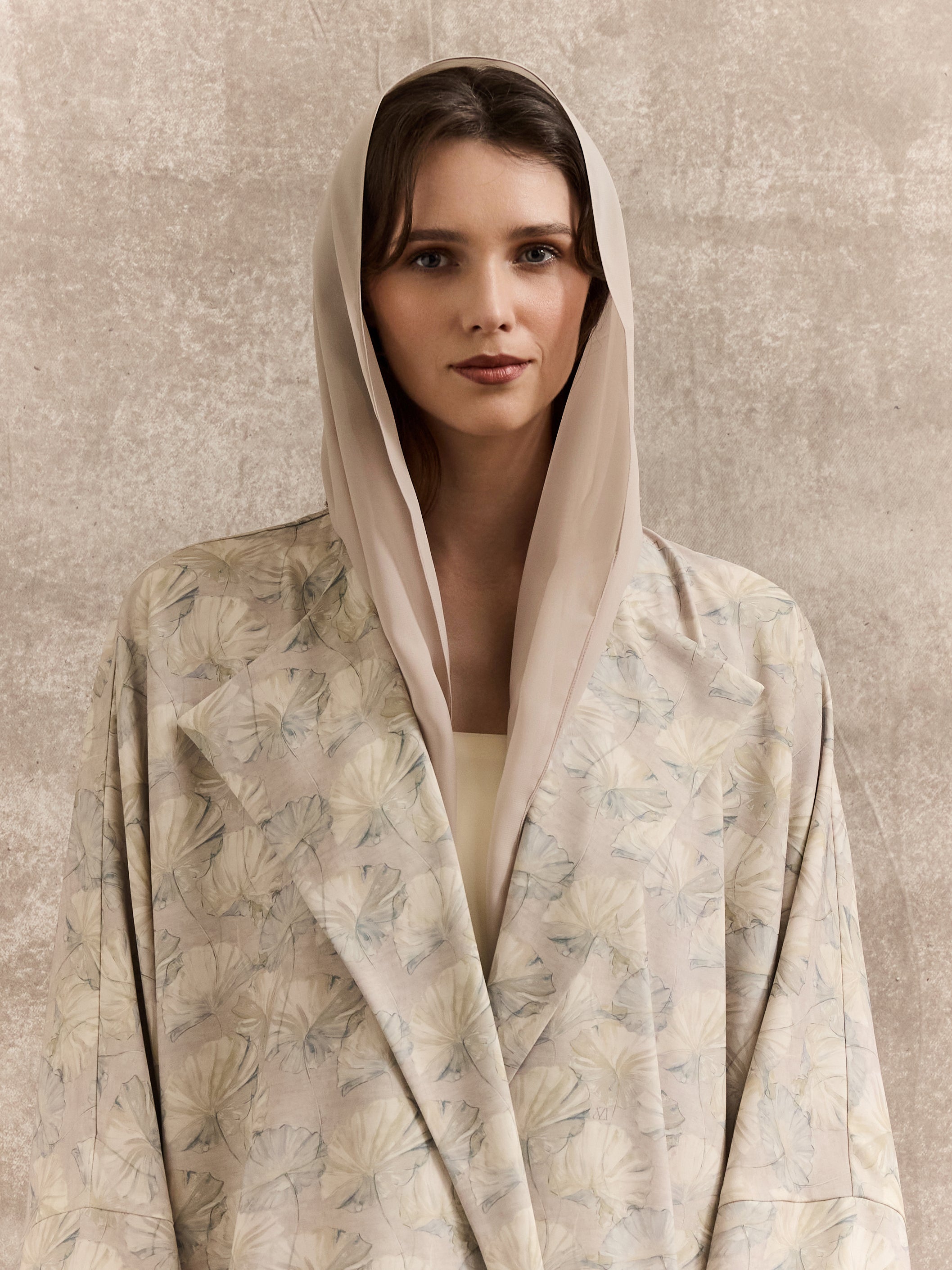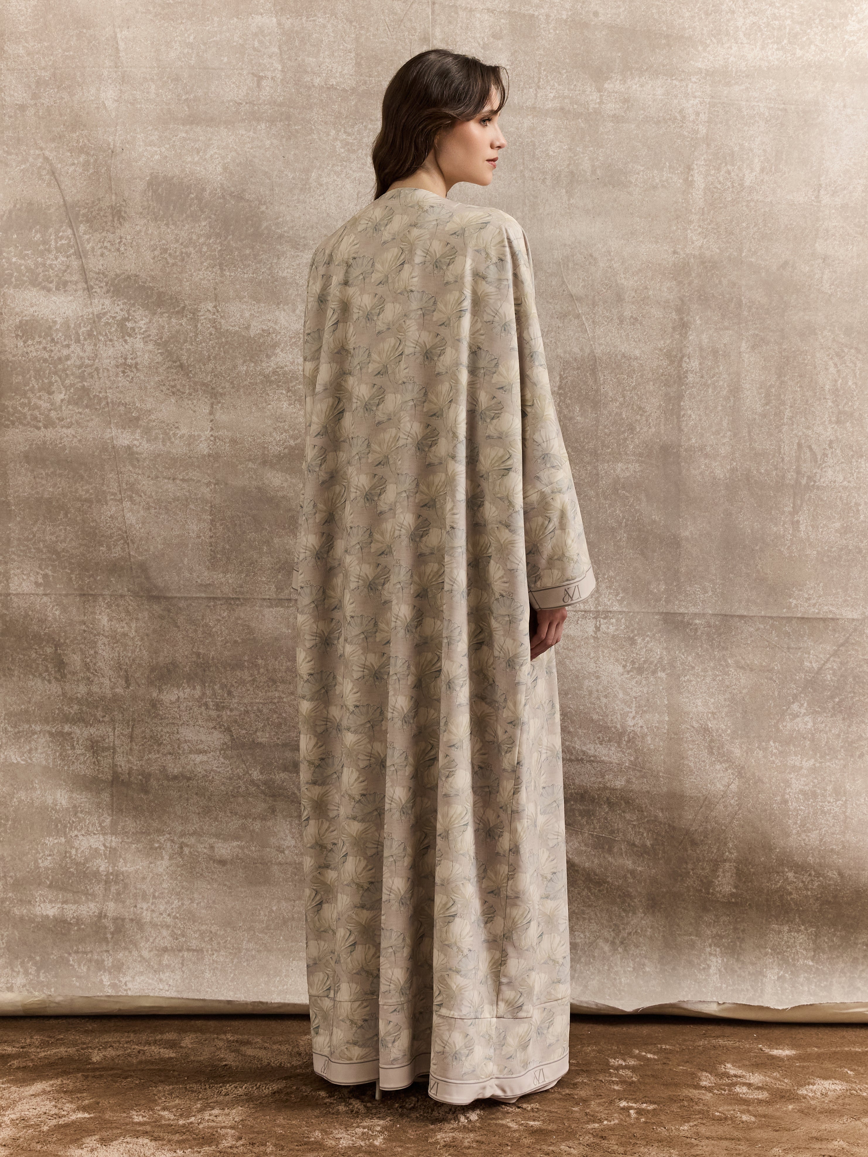 A loose-fit crepe silk abaya featuring a subtle off-white and beige print, designed with flowing lines and an elegant drape for understated sophistication.