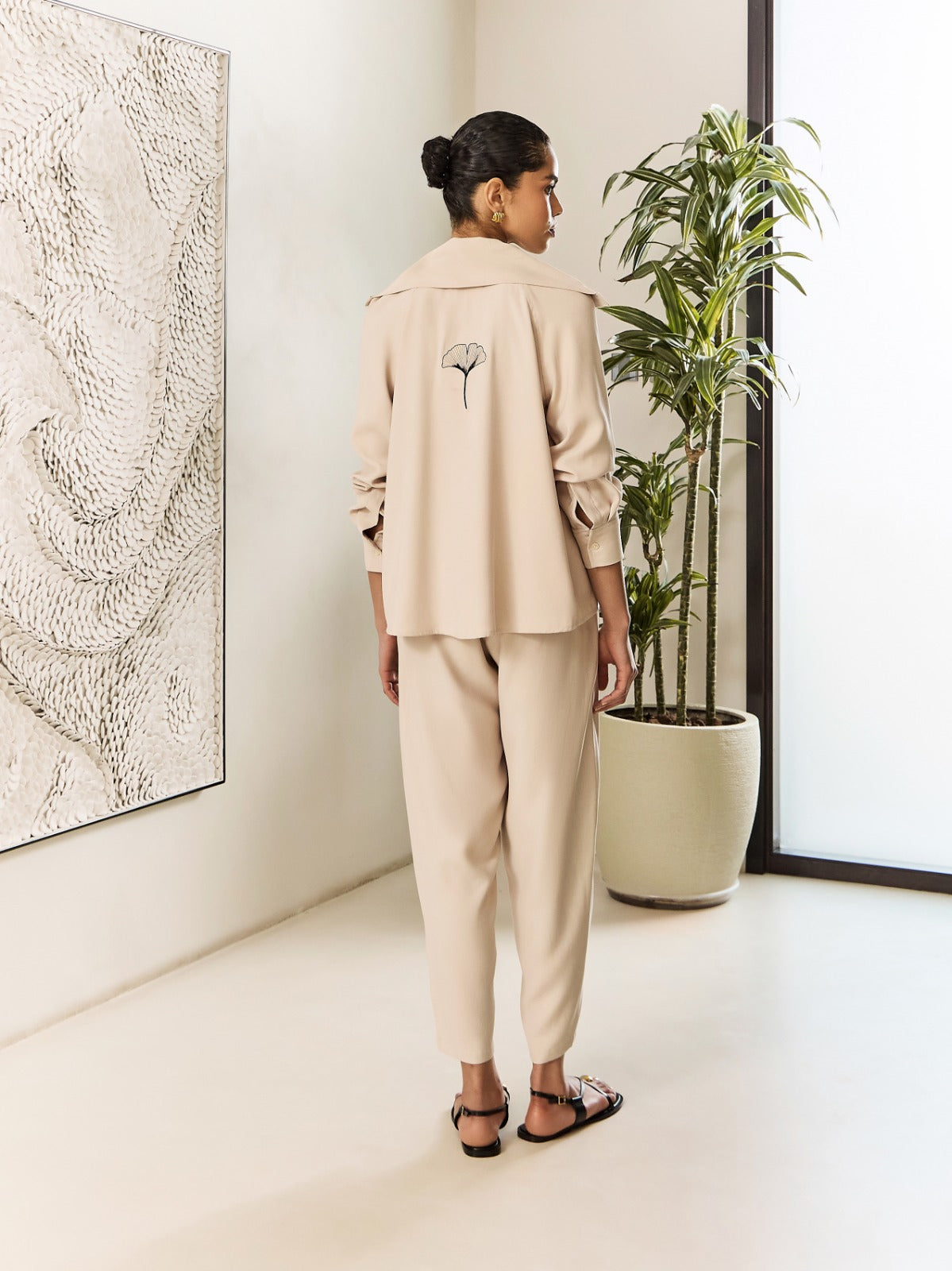 Relaxed Tencel co-ord set with a loose button-down shirt and tapered elastic-waist pants.