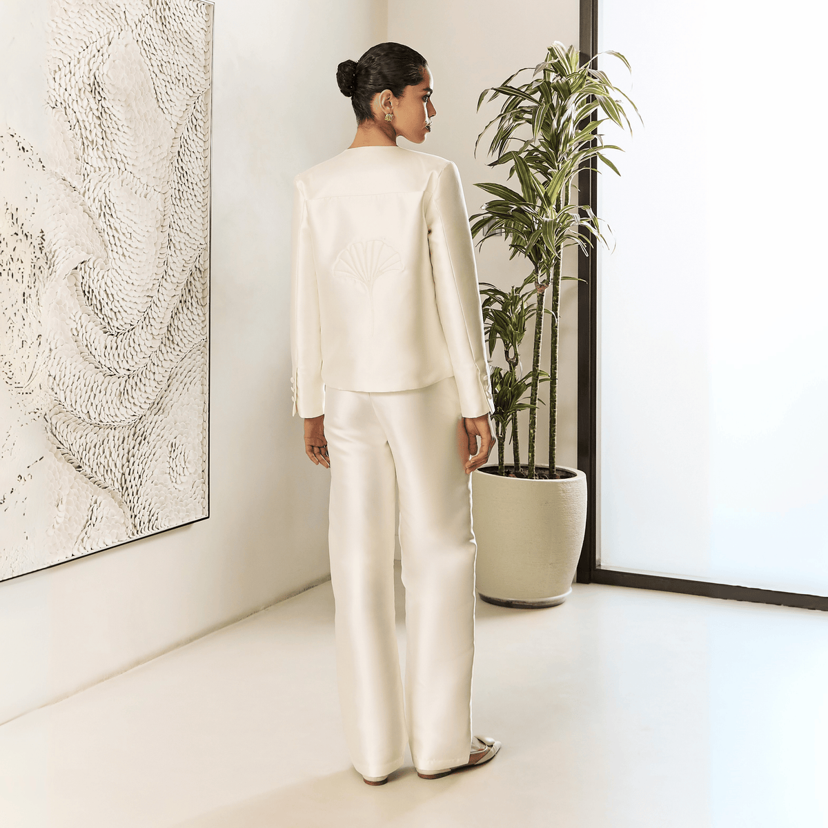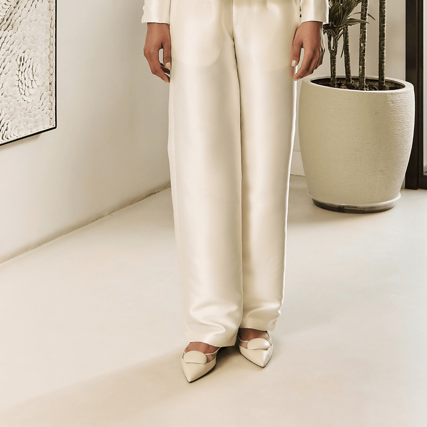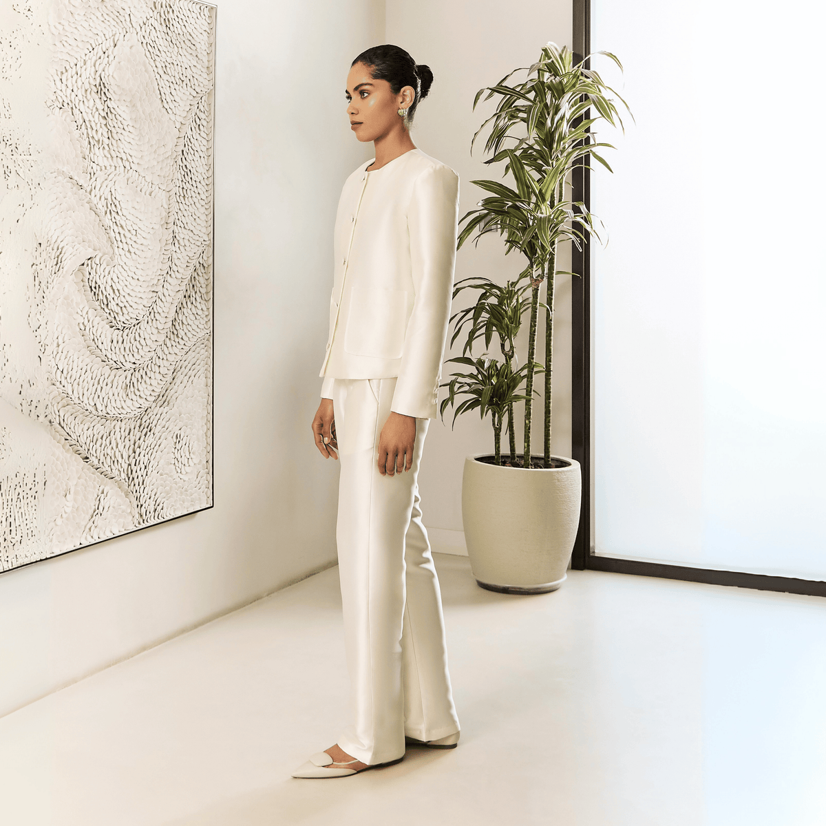 Tailored cream pants in rich Micado fabric, designed with a straight-leg fit and a subtle sheen for an elevated finish.
