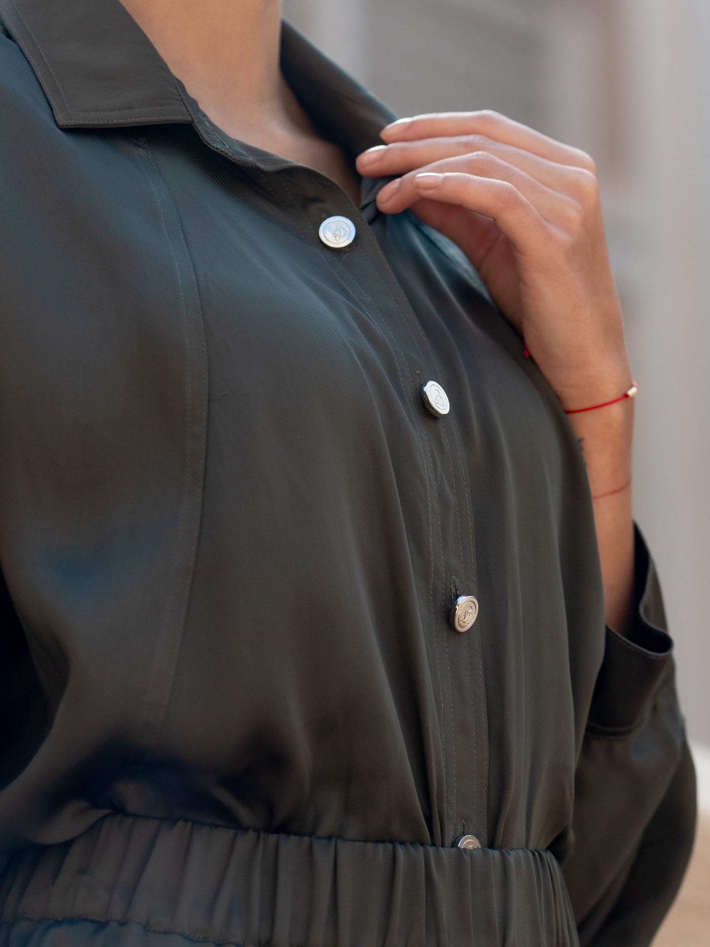 A flowing olive two-piece set featuring a sleek button-down shirt and a soft, draped midi skirt for effortless elegance.