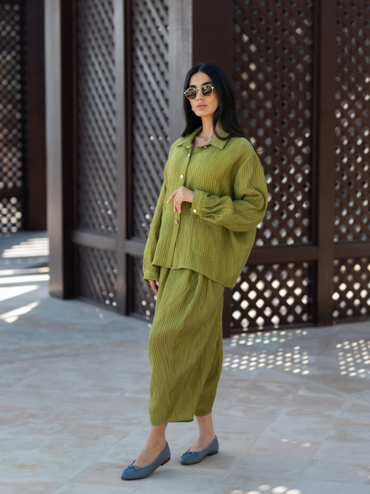 A relaxed-fit crinkle-textured co-ord set featuring an easy button-down top and elastic-waist bottoms for effortless, all-day comfort