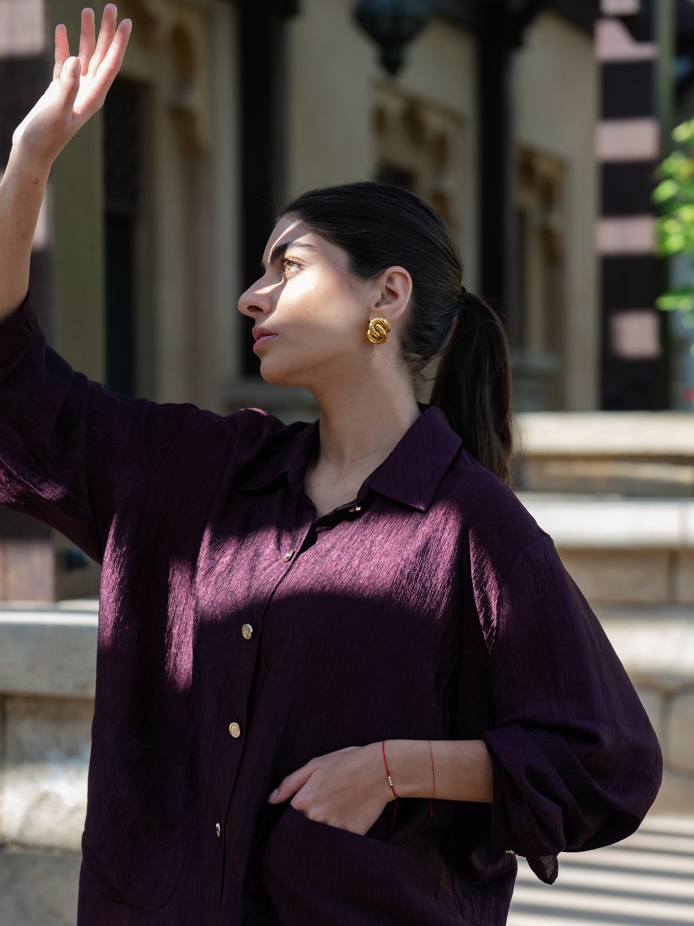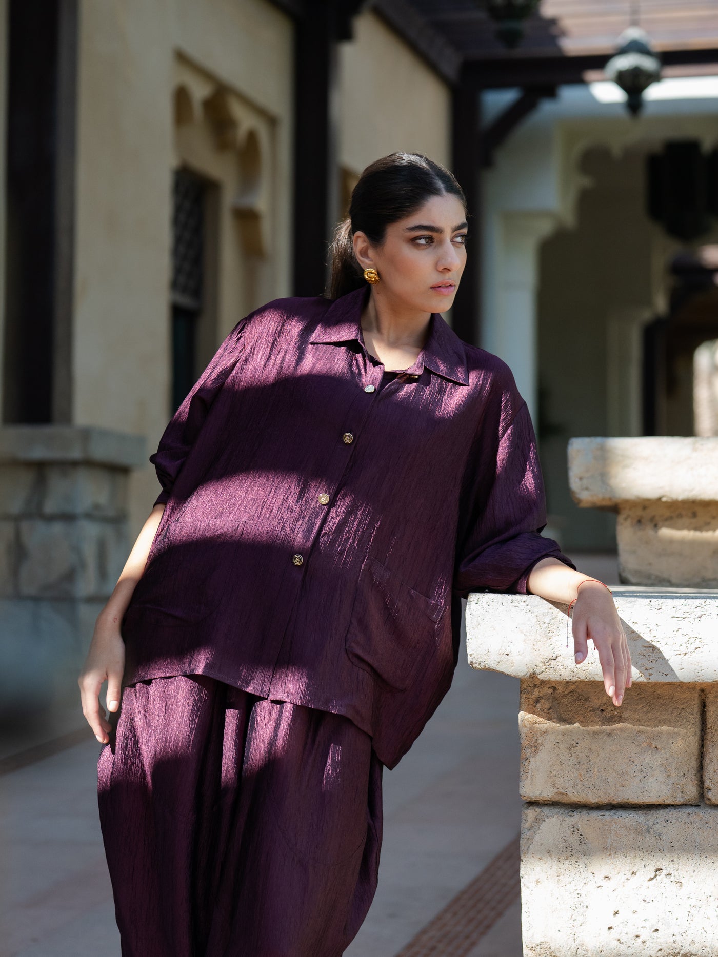 A relaxed-fit crinkle-textured co-ord set featuring an easy button-down top and elastic-waist bottoms for effortless, all-day comfort