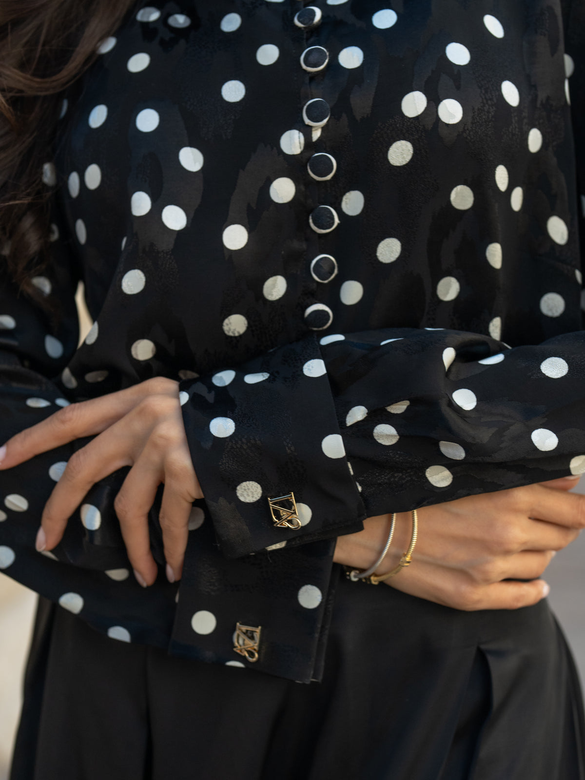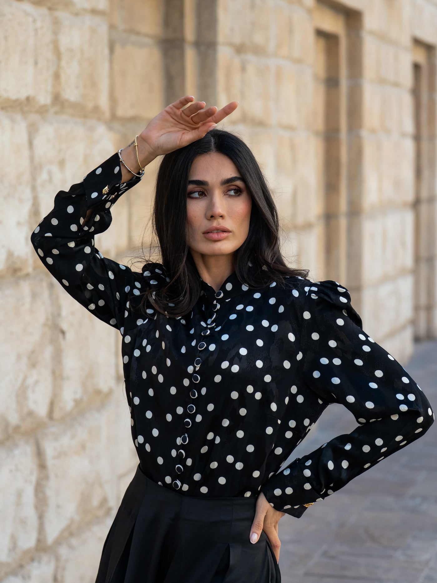 Elegant black polka-dot shirt with a refined button-down front and softly puffed long sleeves, paired with long black culottes featuring a comfortable elastic waistband for effortless style and ease