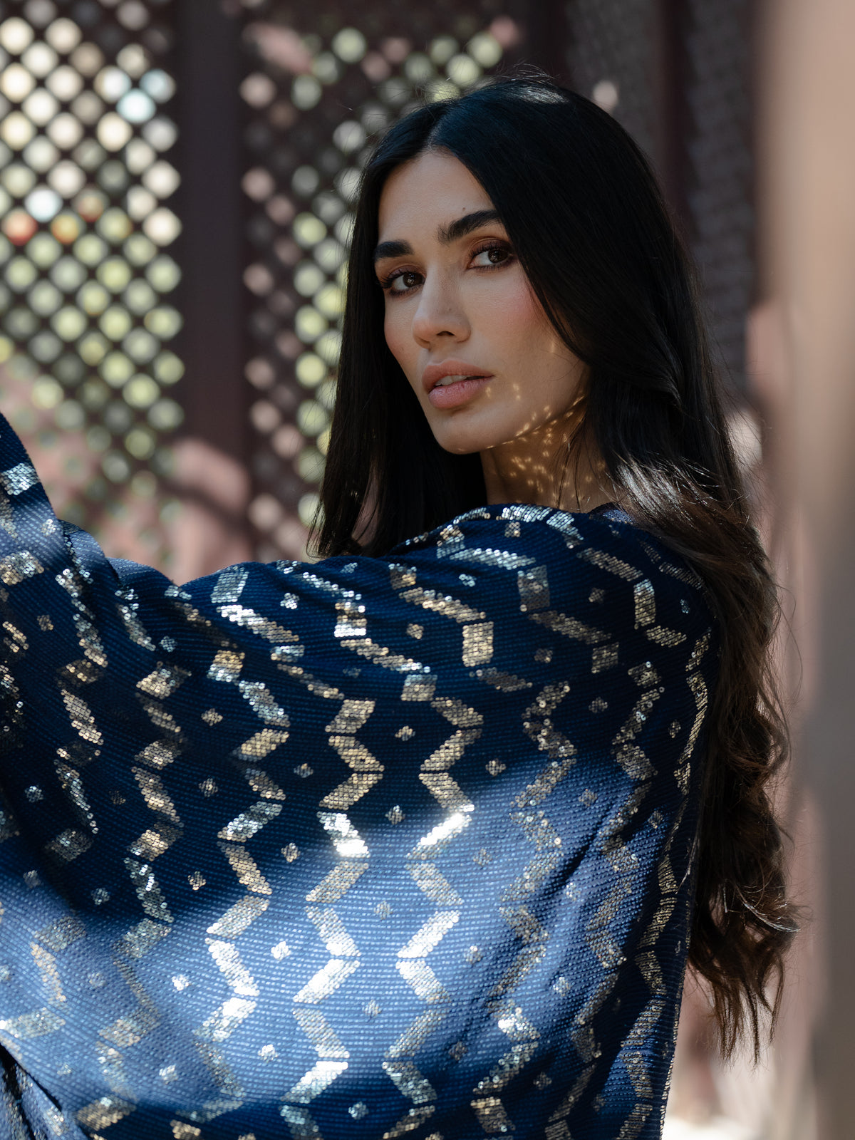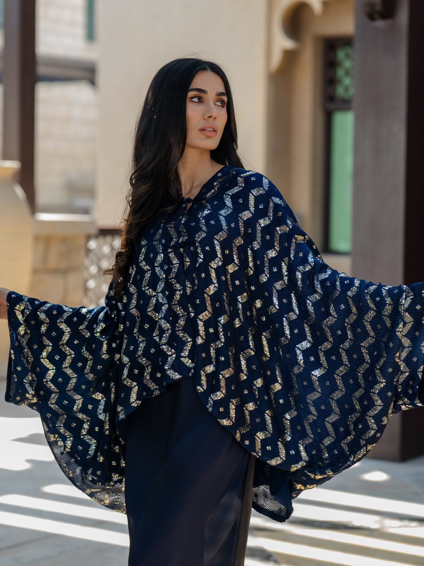 Elegant slip dress paired with a flowing chiffon cape adorned with& shimmering embroidery.