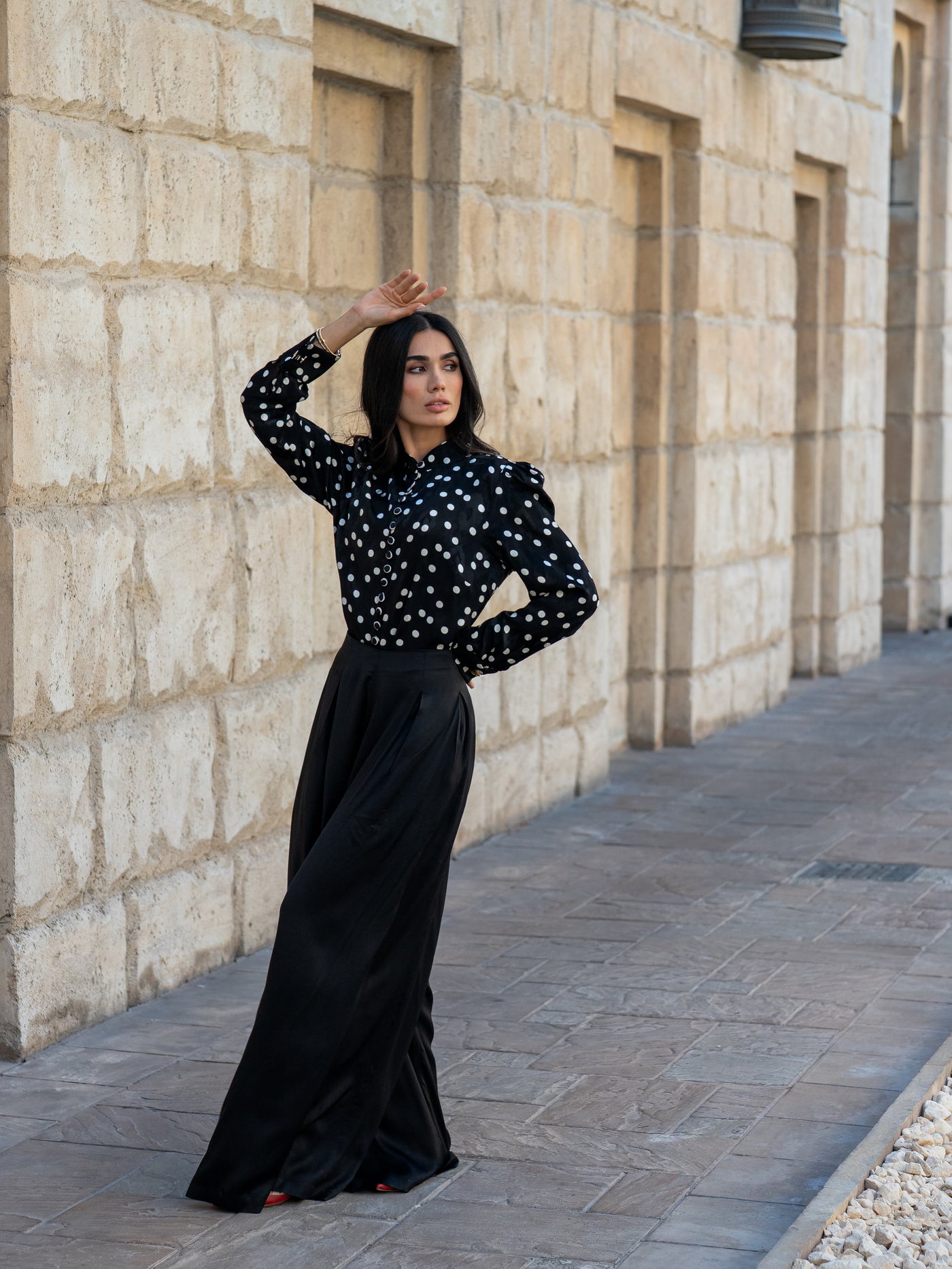 Elegant black polka-dot shirt with a refined button-down front and softly puffed long sleeves, paired with long black culottes featuring a comfortable elastic waistband for effortless style and ease