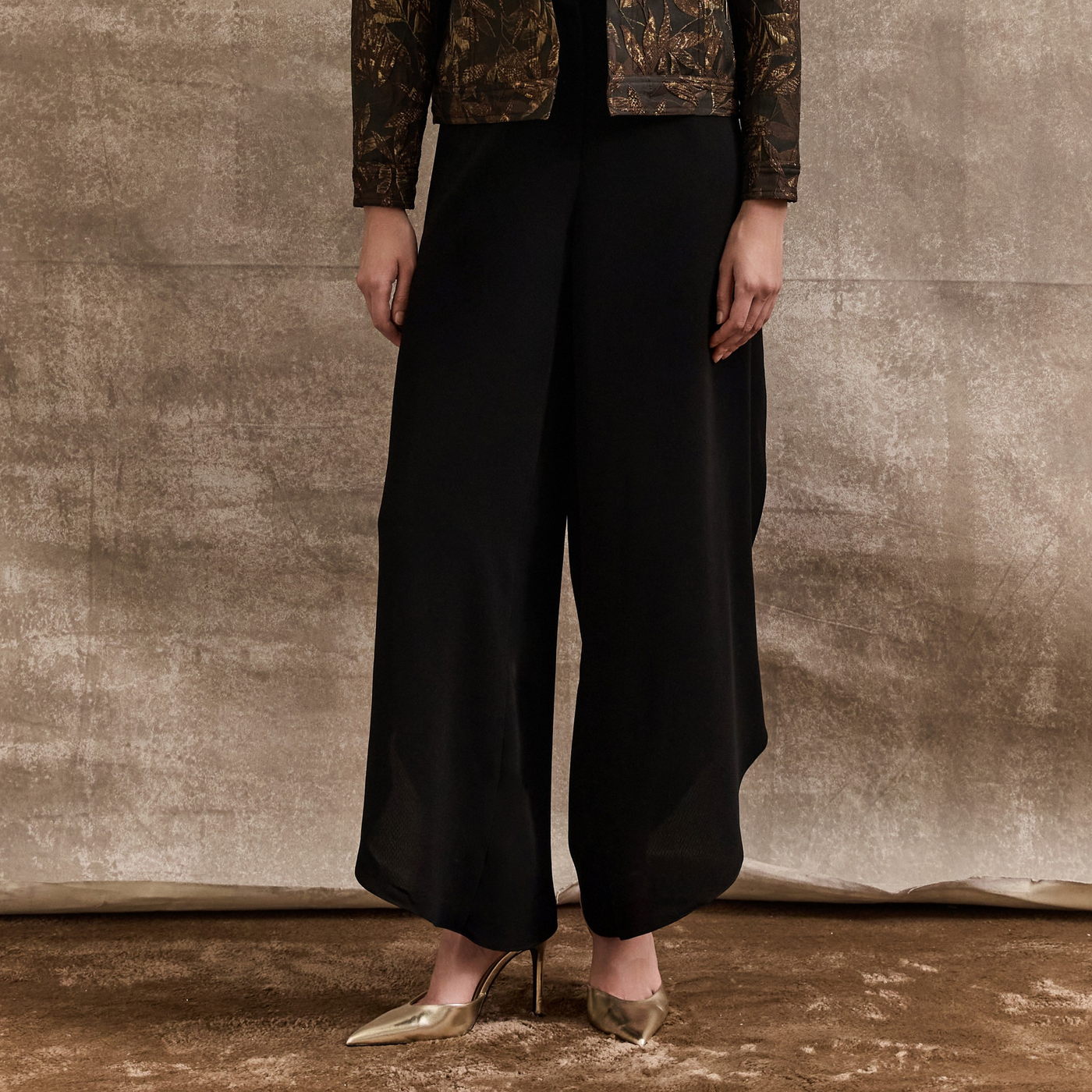 Flowing black crepe wide-leg pants offering elegant drape and movement.