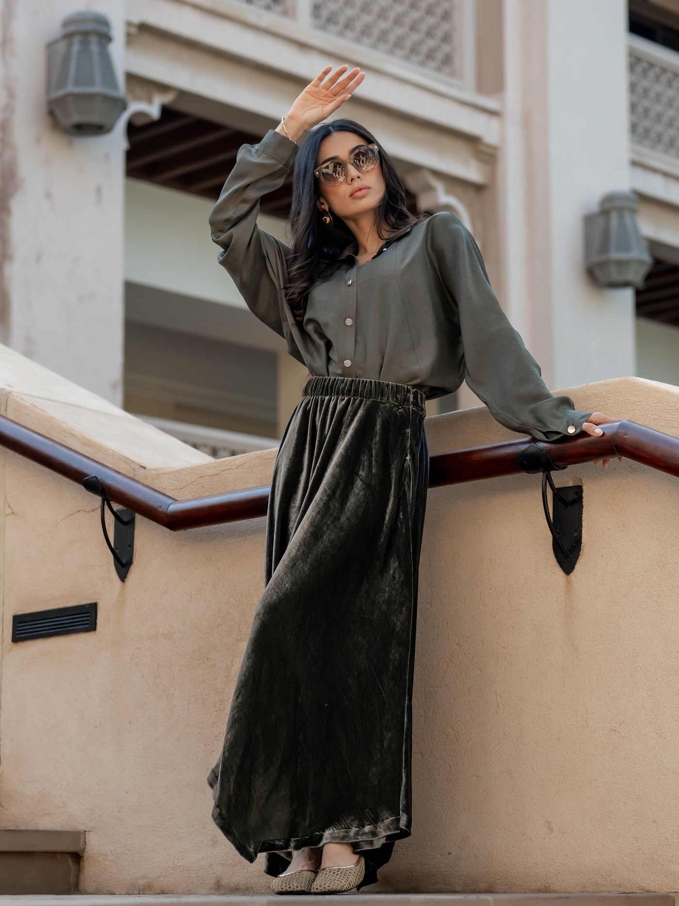 An elegant olive-toned set pairing a relaxed button-down shirt and with a luxe velvet midi skirt.