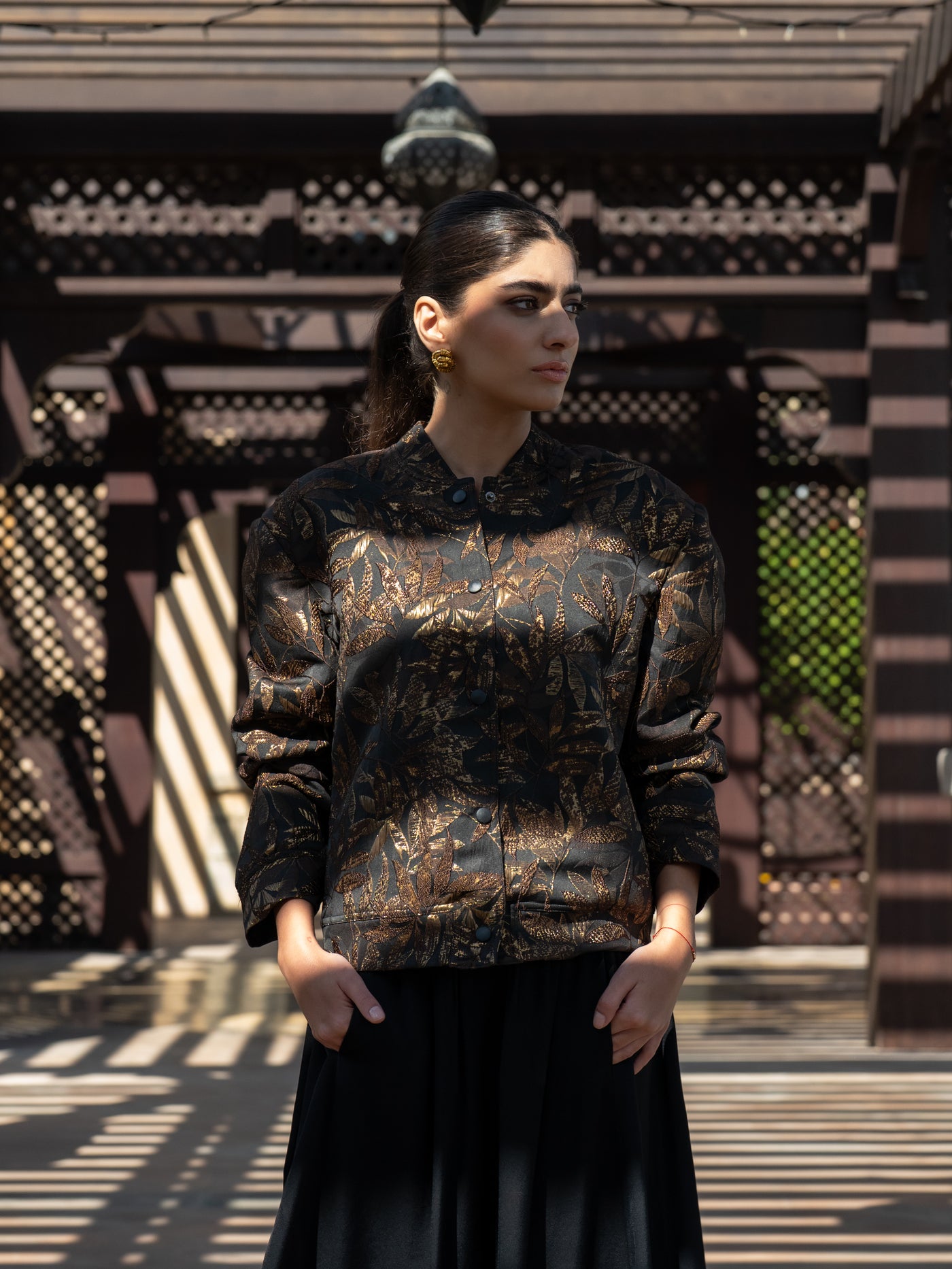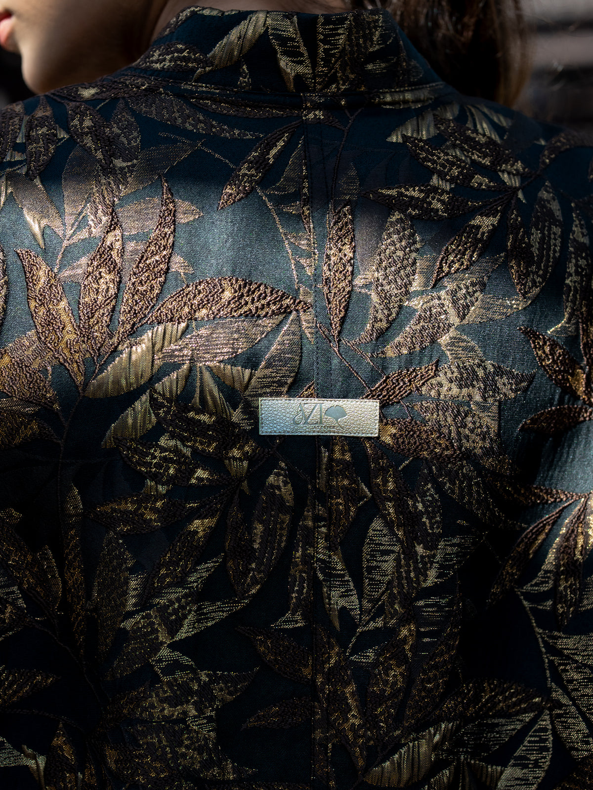 Luxurious brocade bomber jacket featuring an elegant metallic leaf motif, classic snap-button front, and a tailored silhouette for a statement finish.