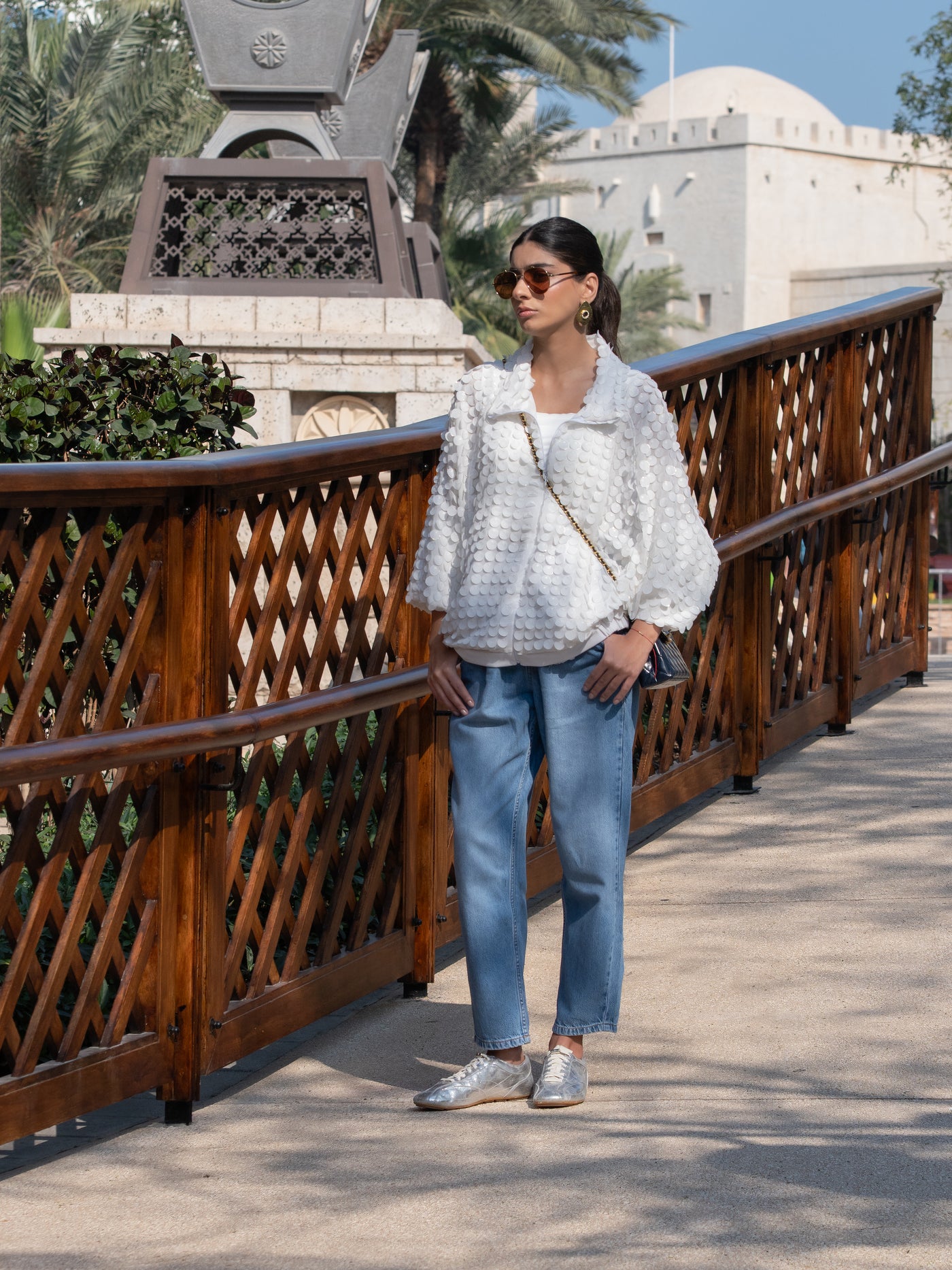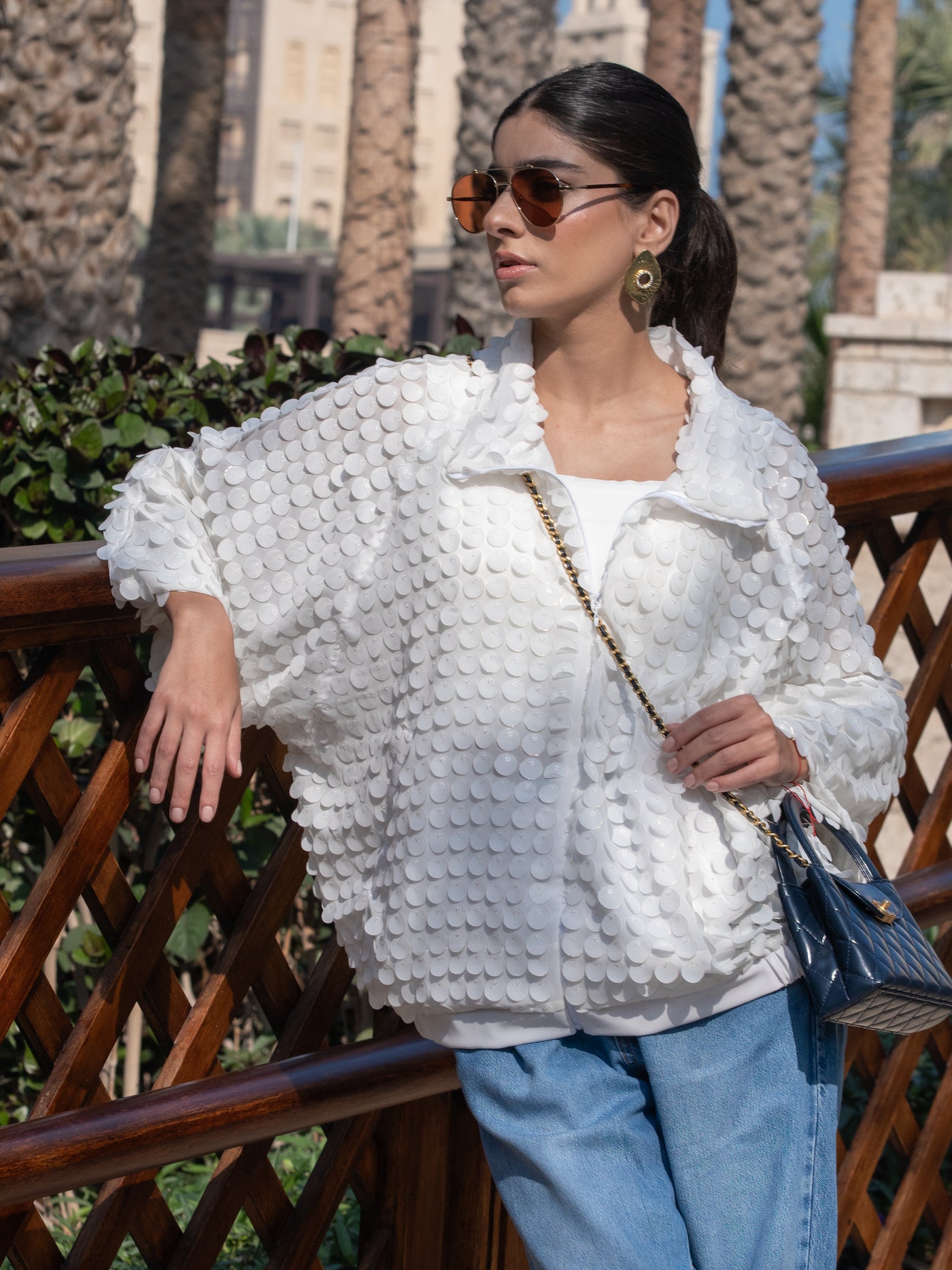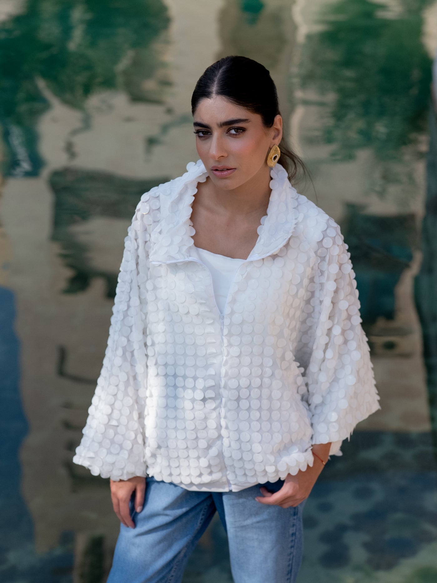 A white statement jacket adorned with textured sequin detailing and a soft stand collar for a modern, elevated look.