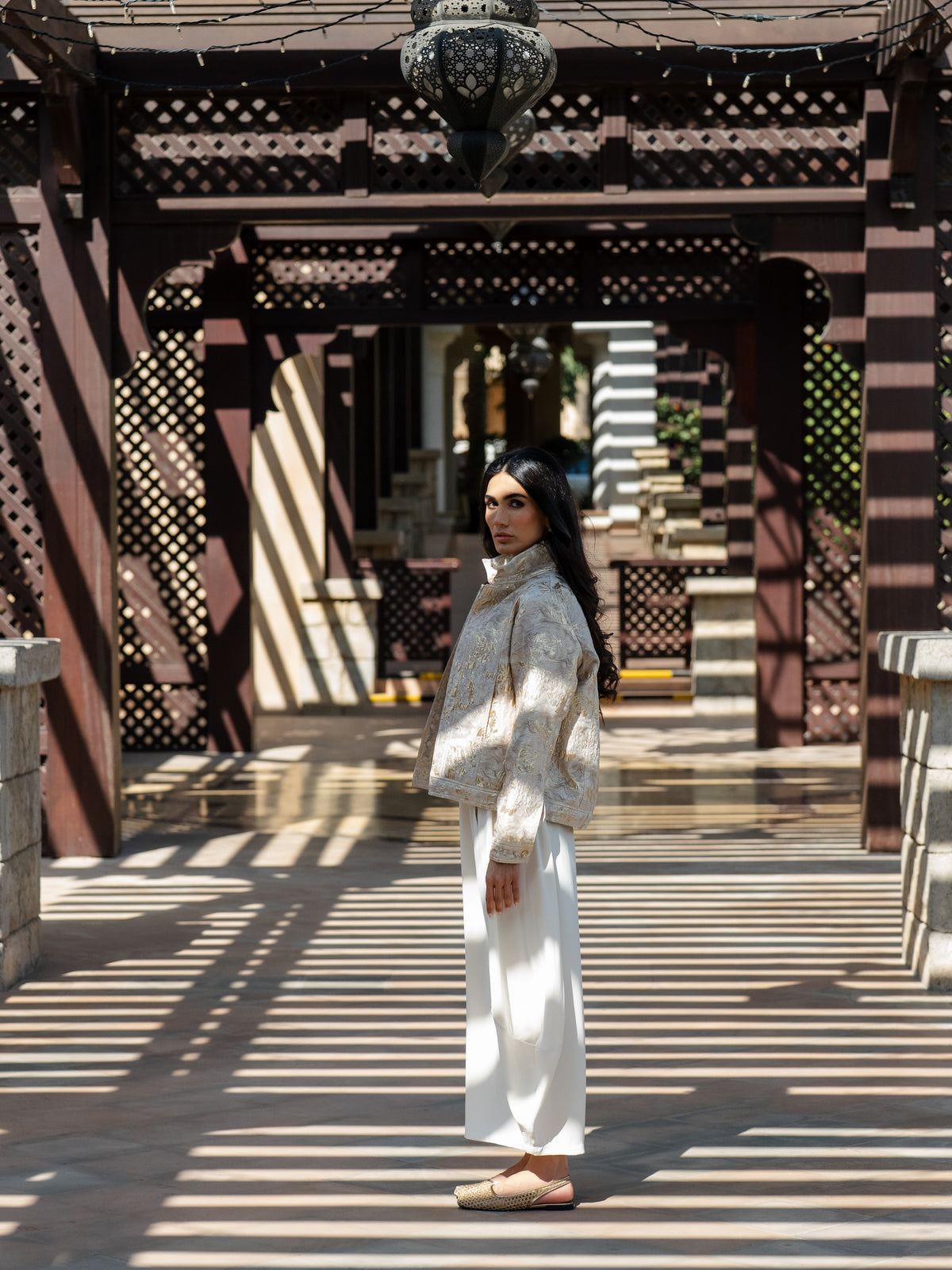 A tailored brocade jacket with a subtle flower-patterned sheen for a refined statement.