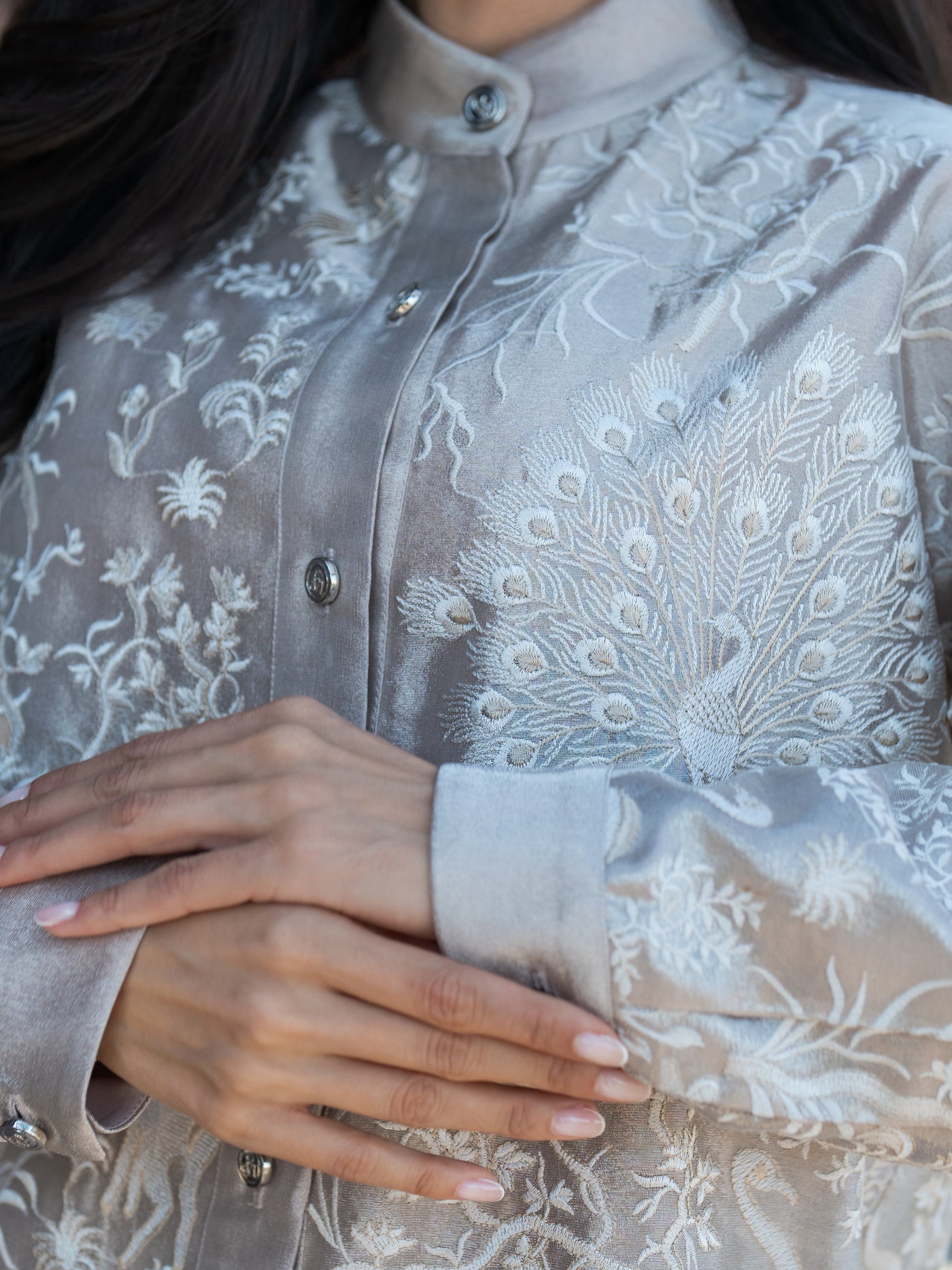 A tailored tissue fabric jacket with a subtle embroidery sheen for a refined statement.