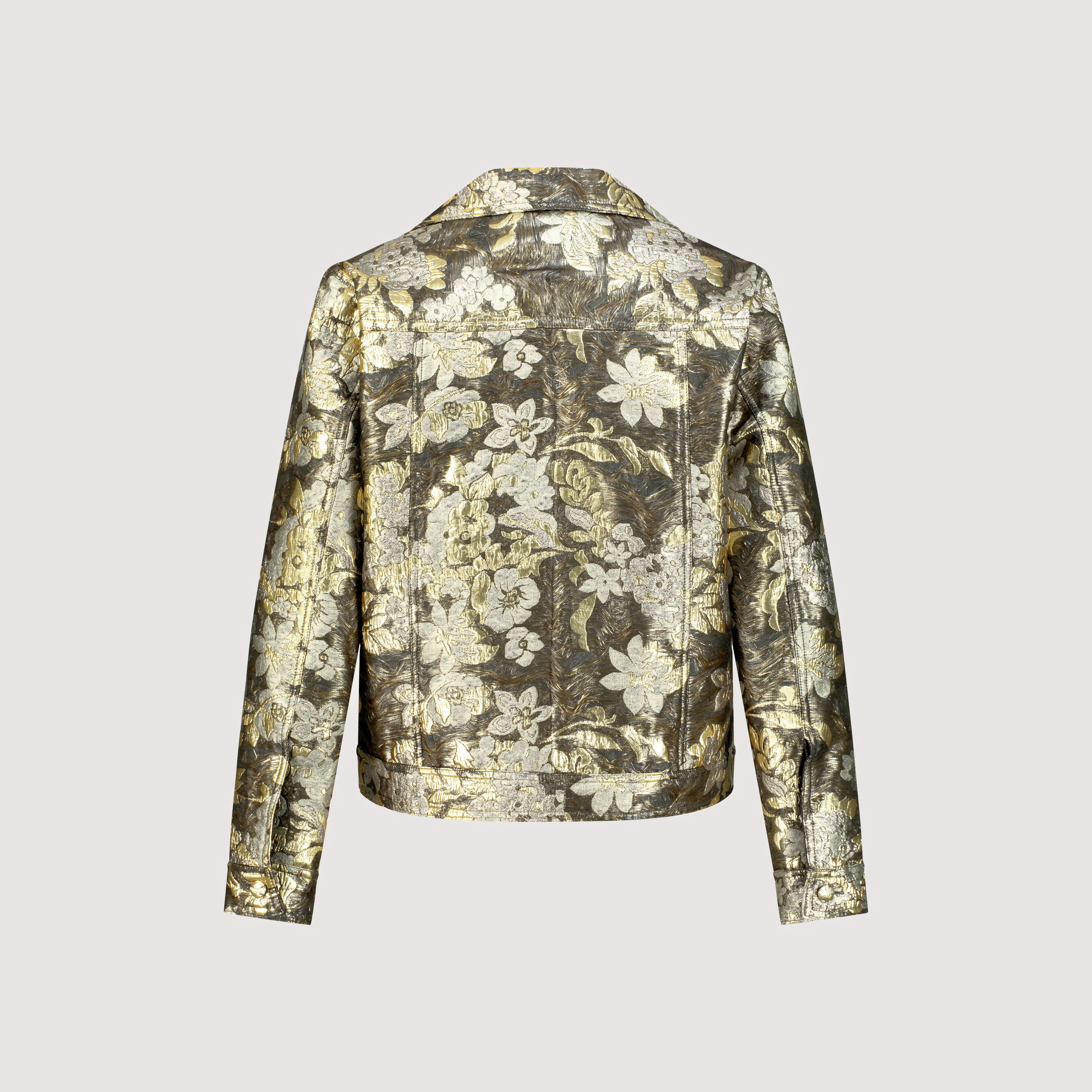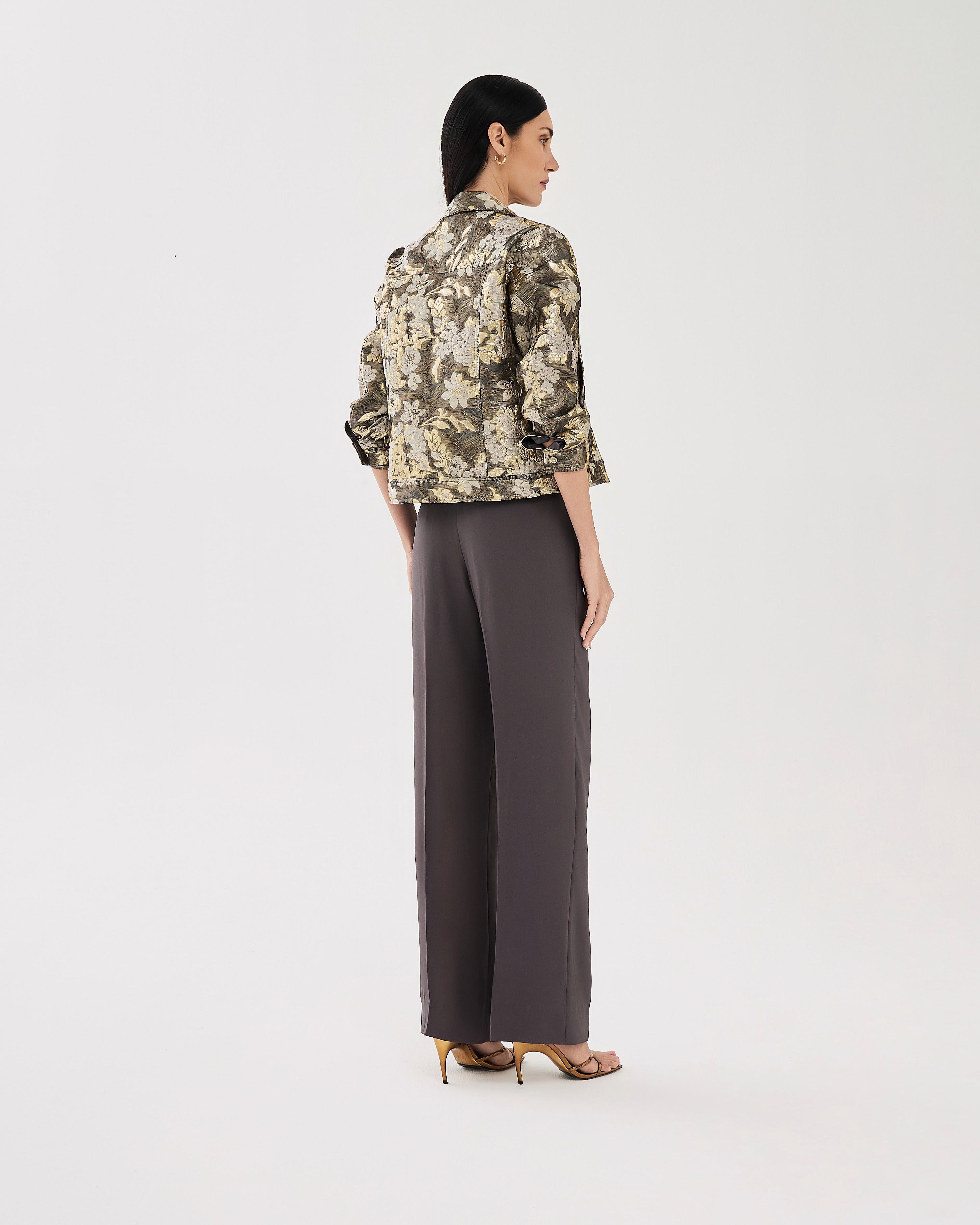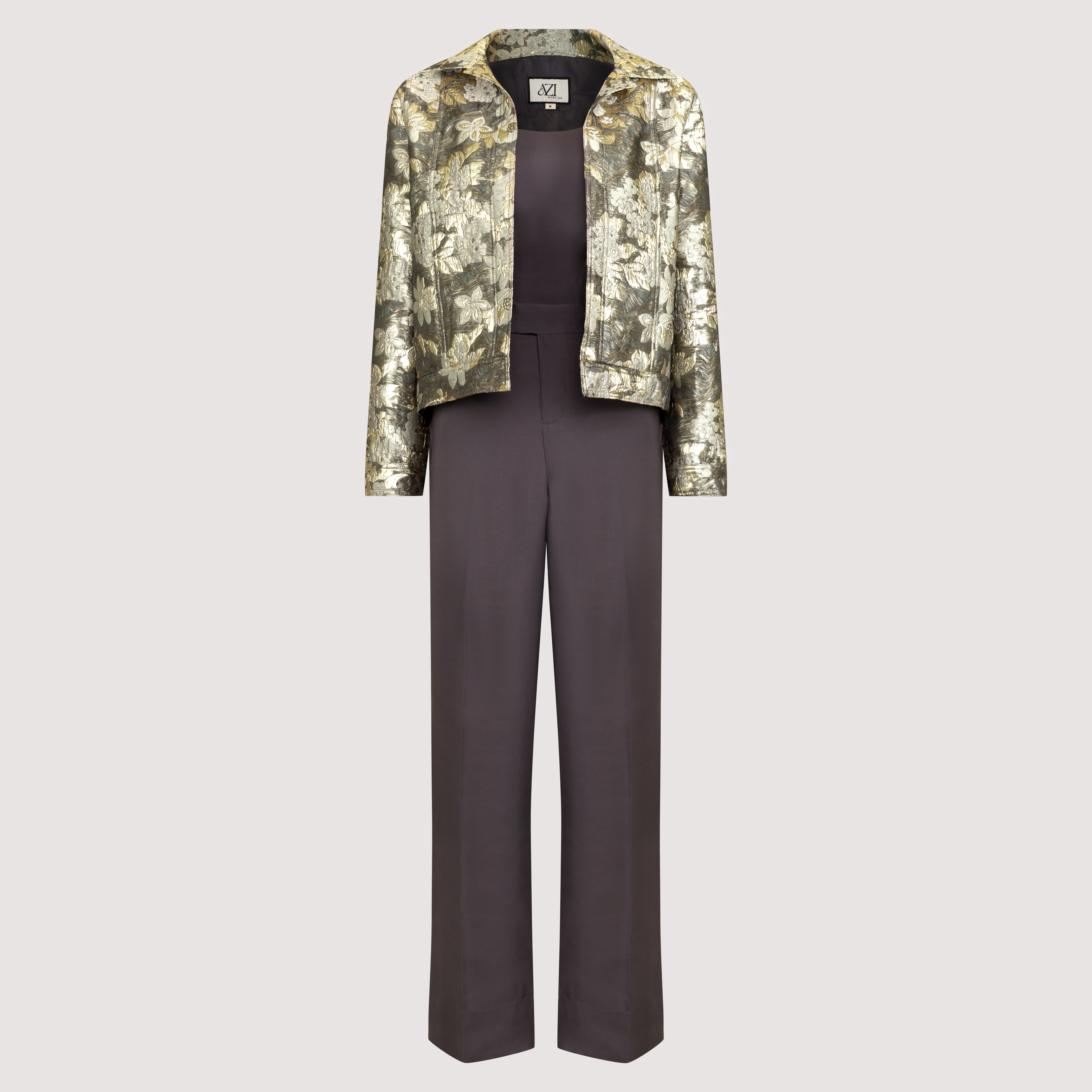 This three-piece set combines a sleek crepe camisole and pants with a cropped brocade jacket, blending fluidity, structure, and subtle shimmer for modern elegance.