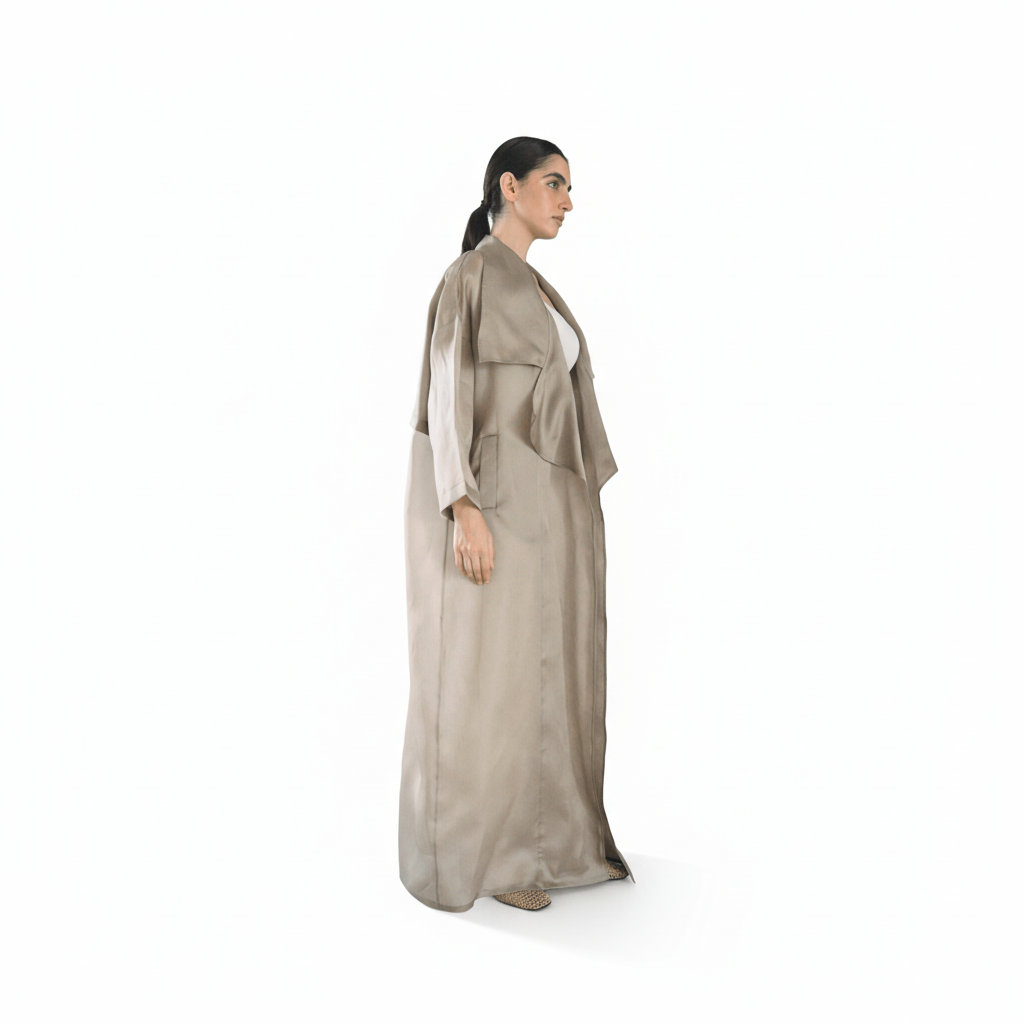 A flowing pure organza trench featuring elegant hand-embellished detailing on the back for a refined, ethereal finish.