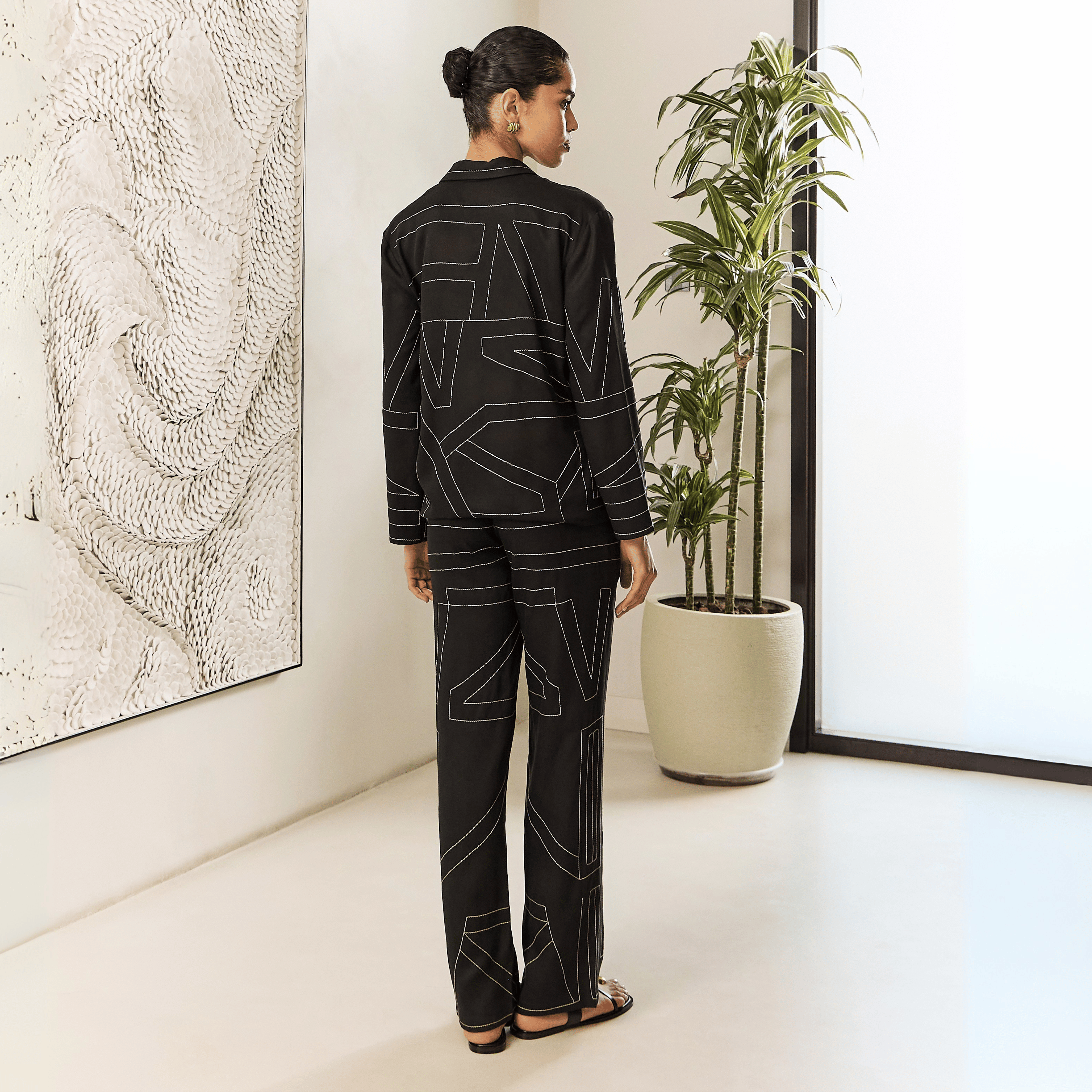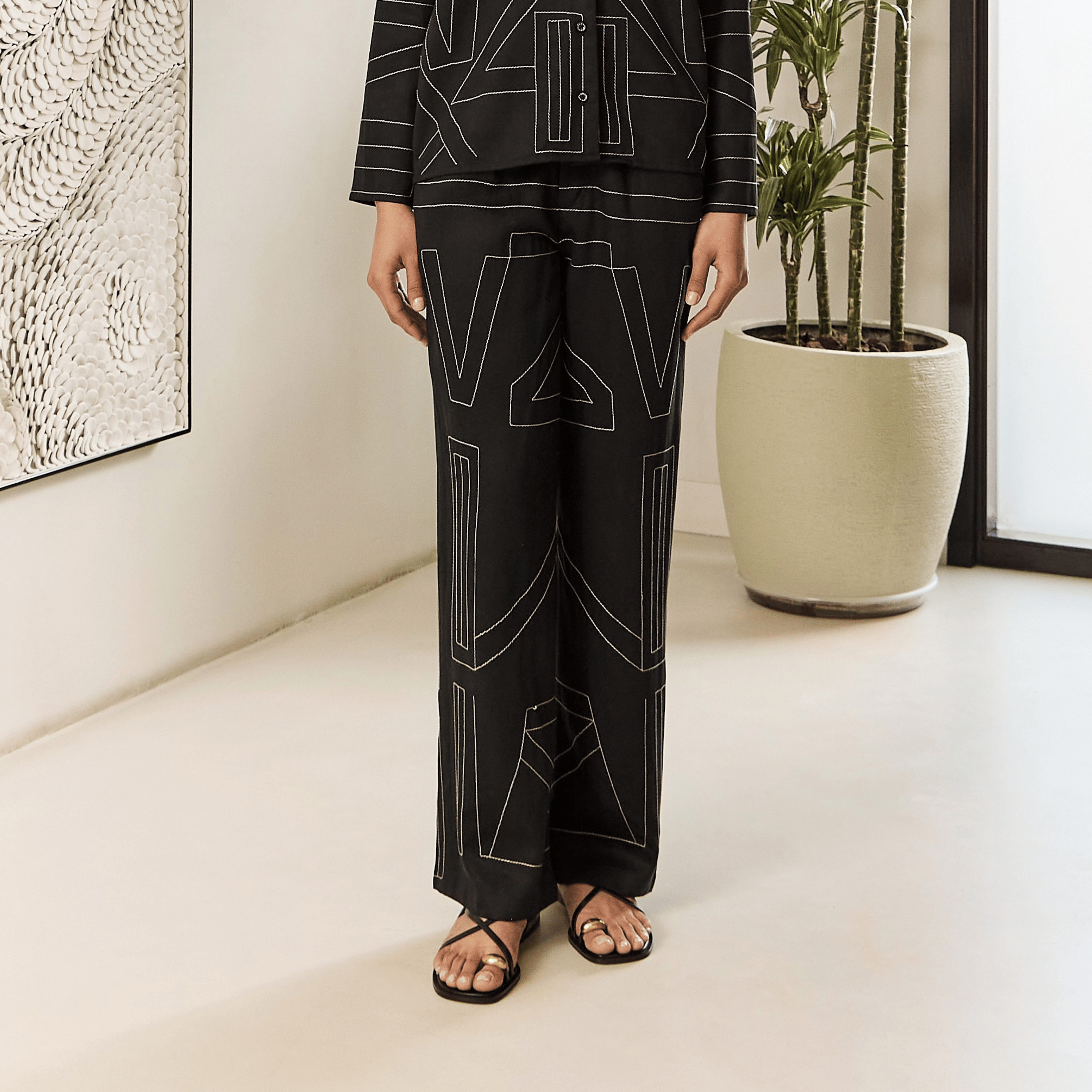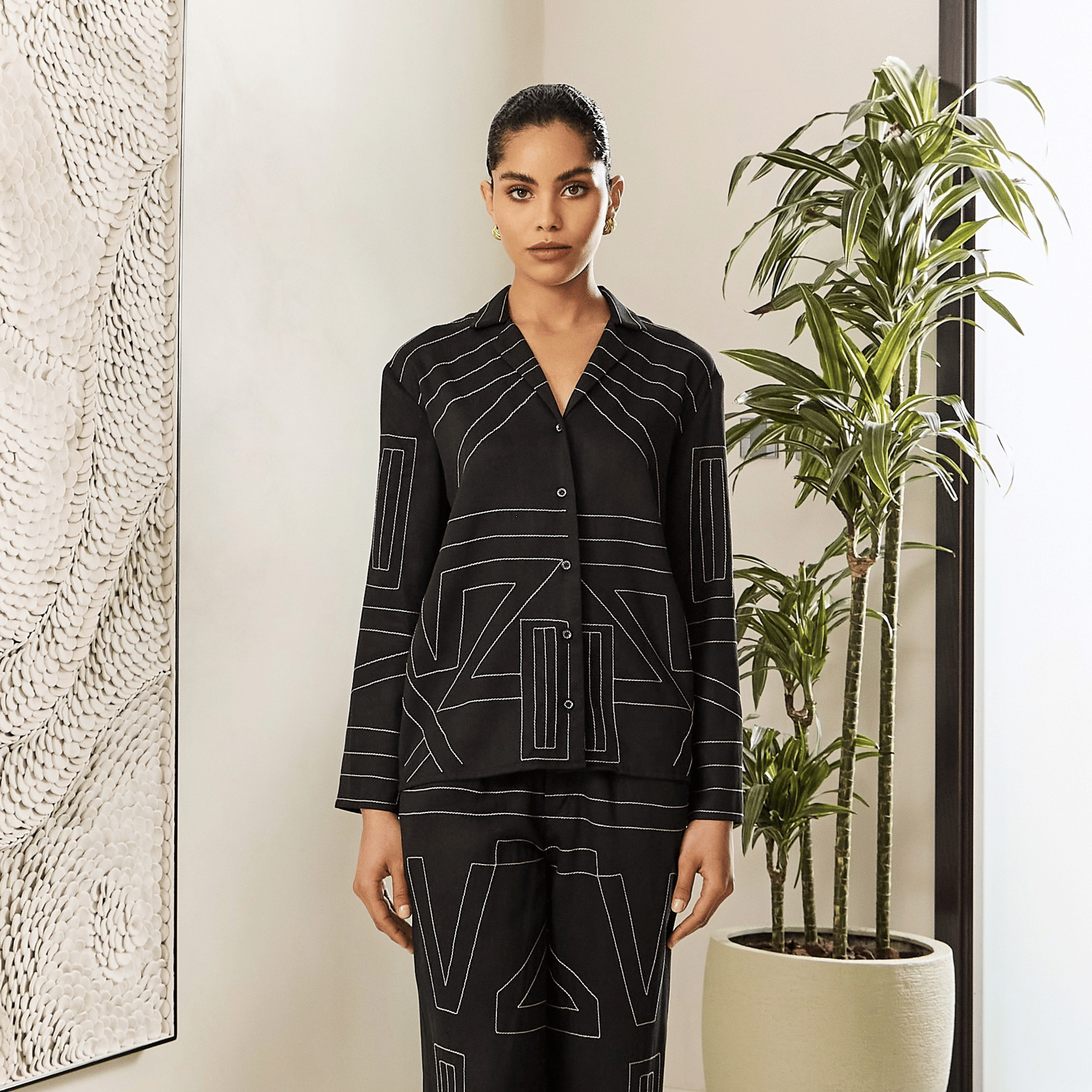 Relaxed tencil and thread cotton co-ord set featuring hand-done running stitches in bold geometric patterns.