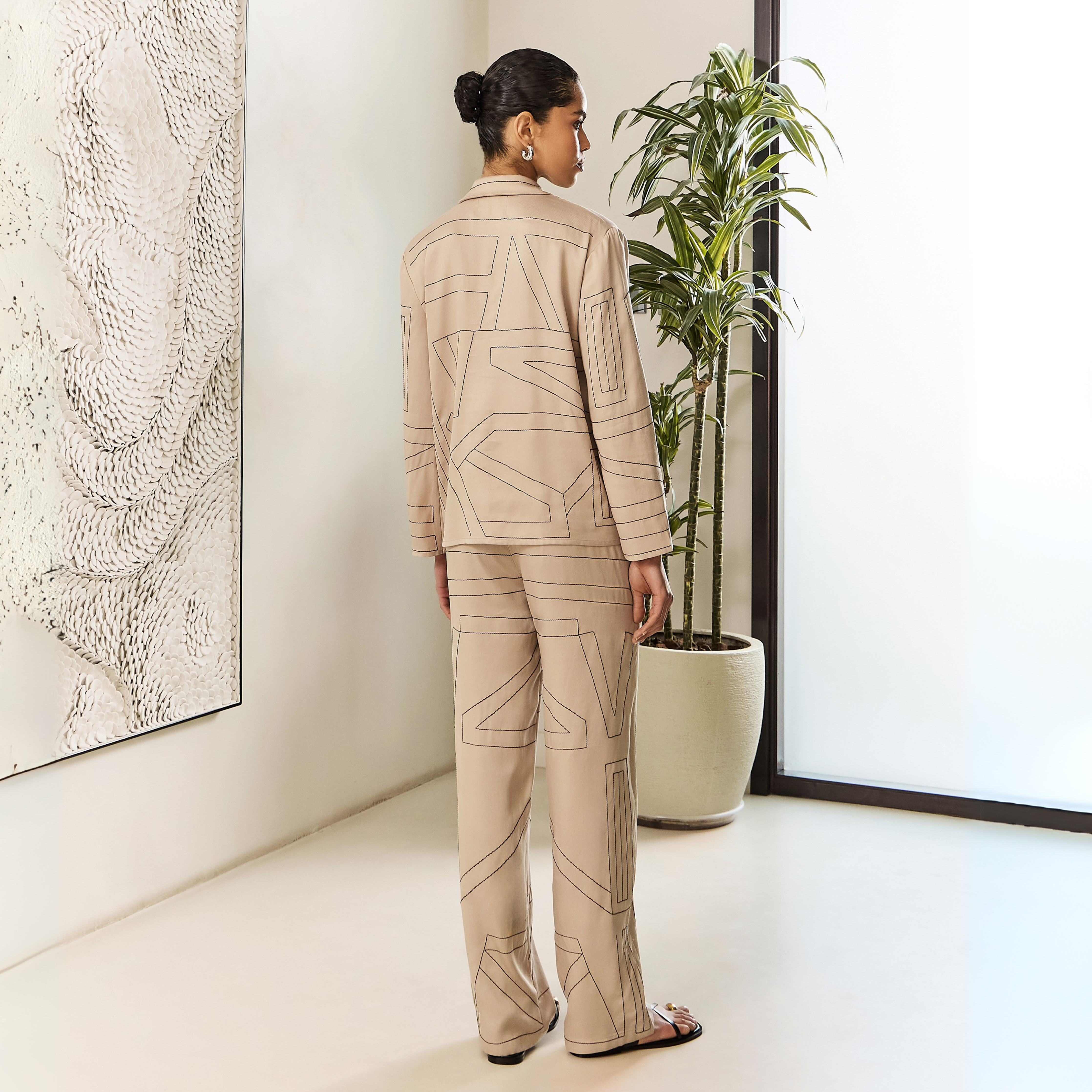 Relaxed tencil and thread cotton co-ord set featuring hand-done running stitches in bold geometric patterns.