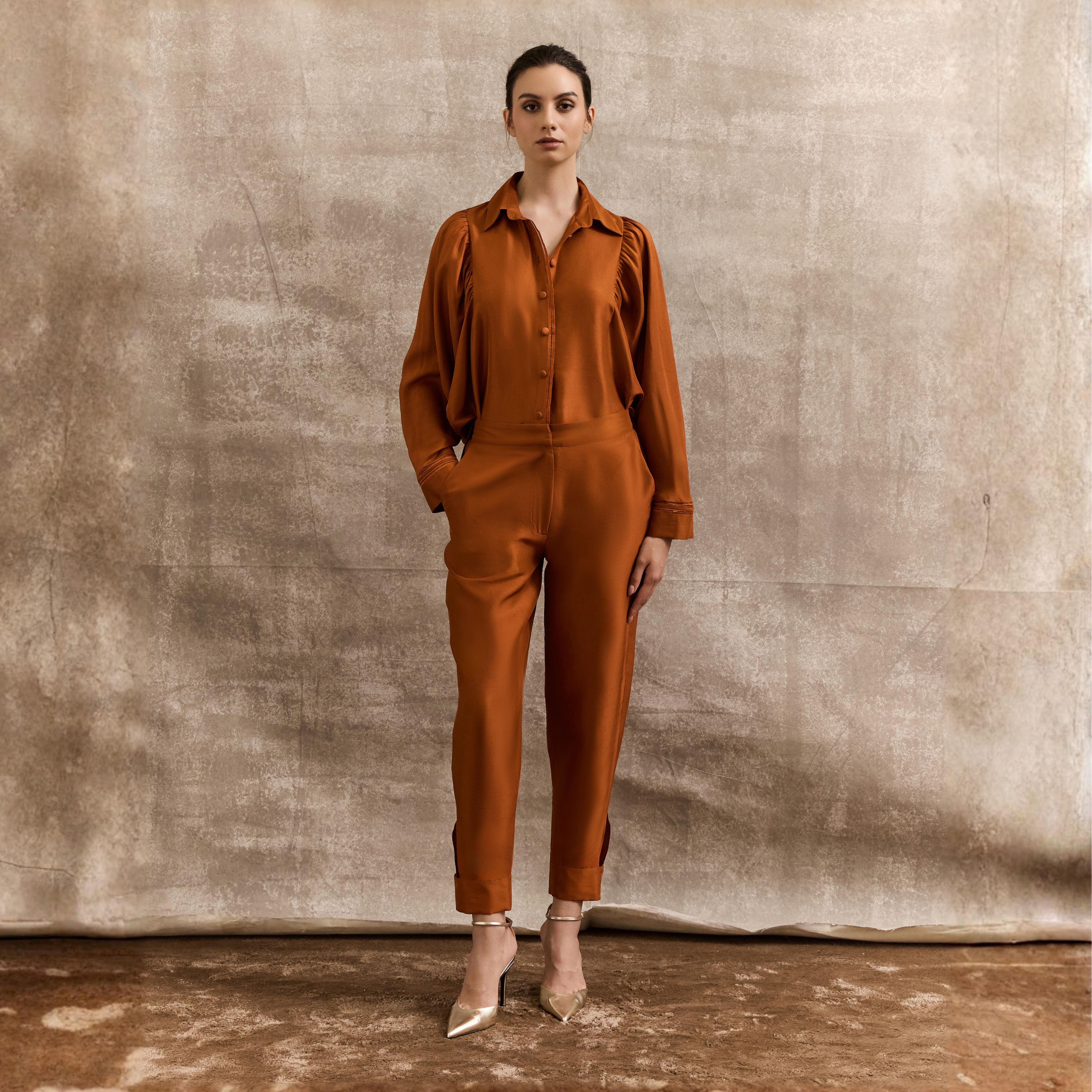 A stylish bat-sleeve shirt with soft gathers and button detailing for effortless elegance. Hem-cuffed pants with an elastic waistband, blending comfort with a tailored finish.