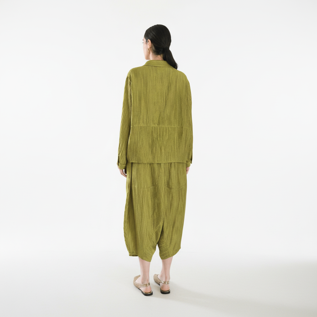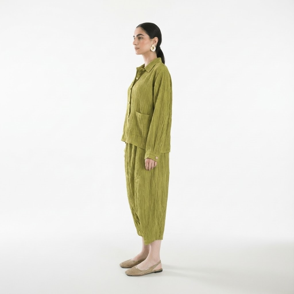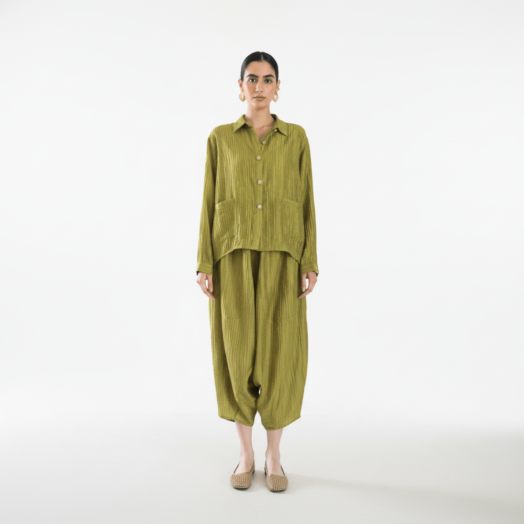 A relaxed-fit crinkle-textured co-ord set featuring an easy button-down top and elastic-waist bottoms for effortless, all-day comfort.