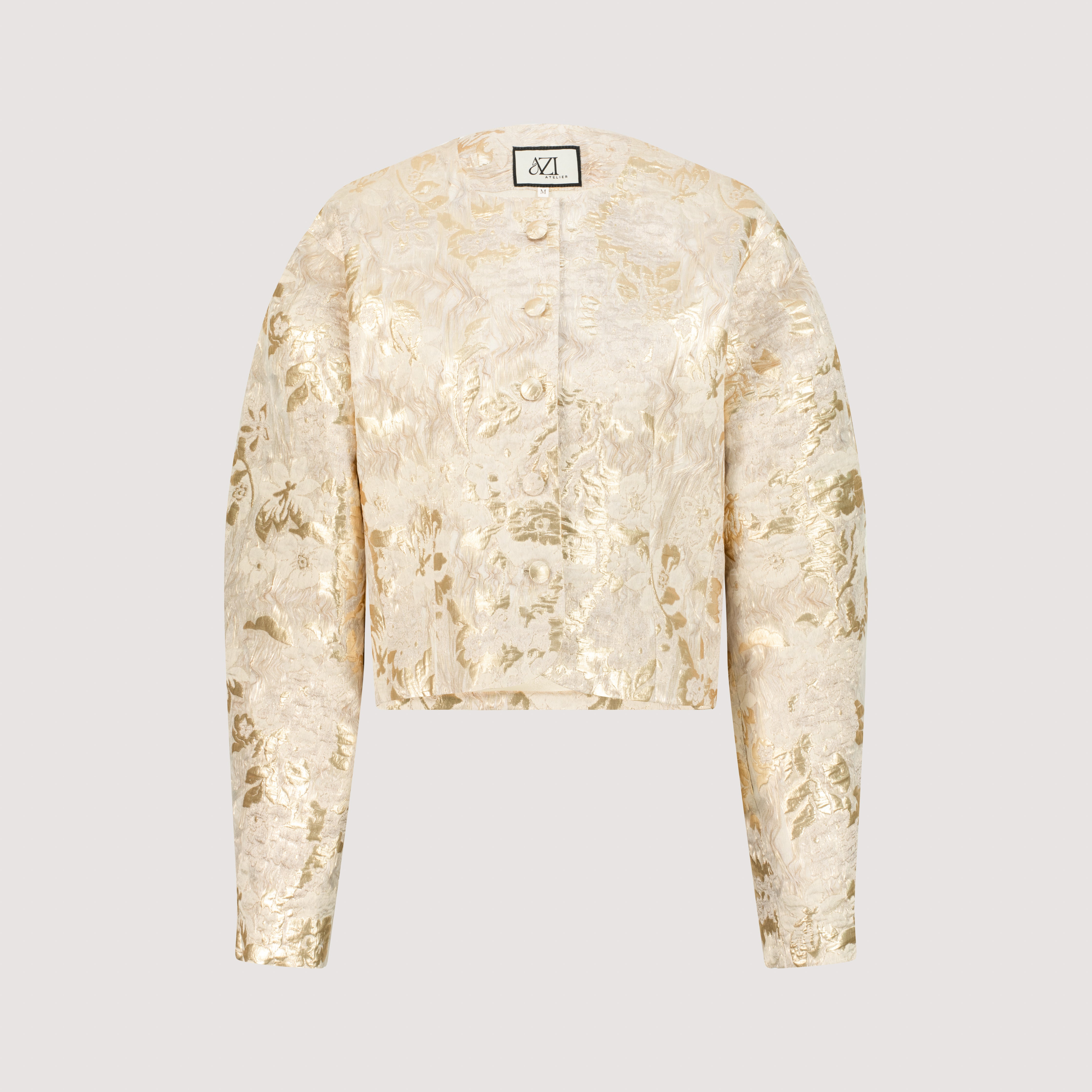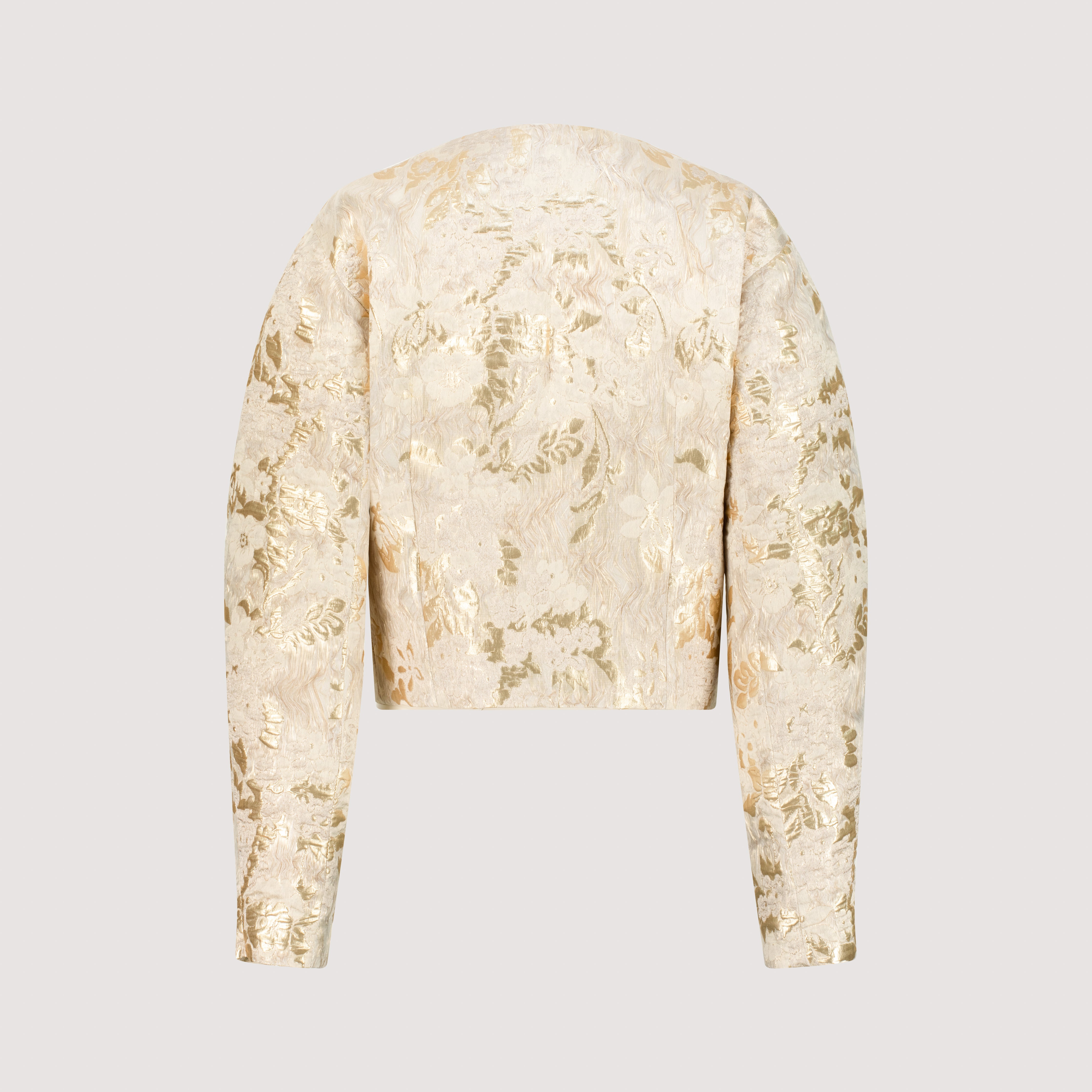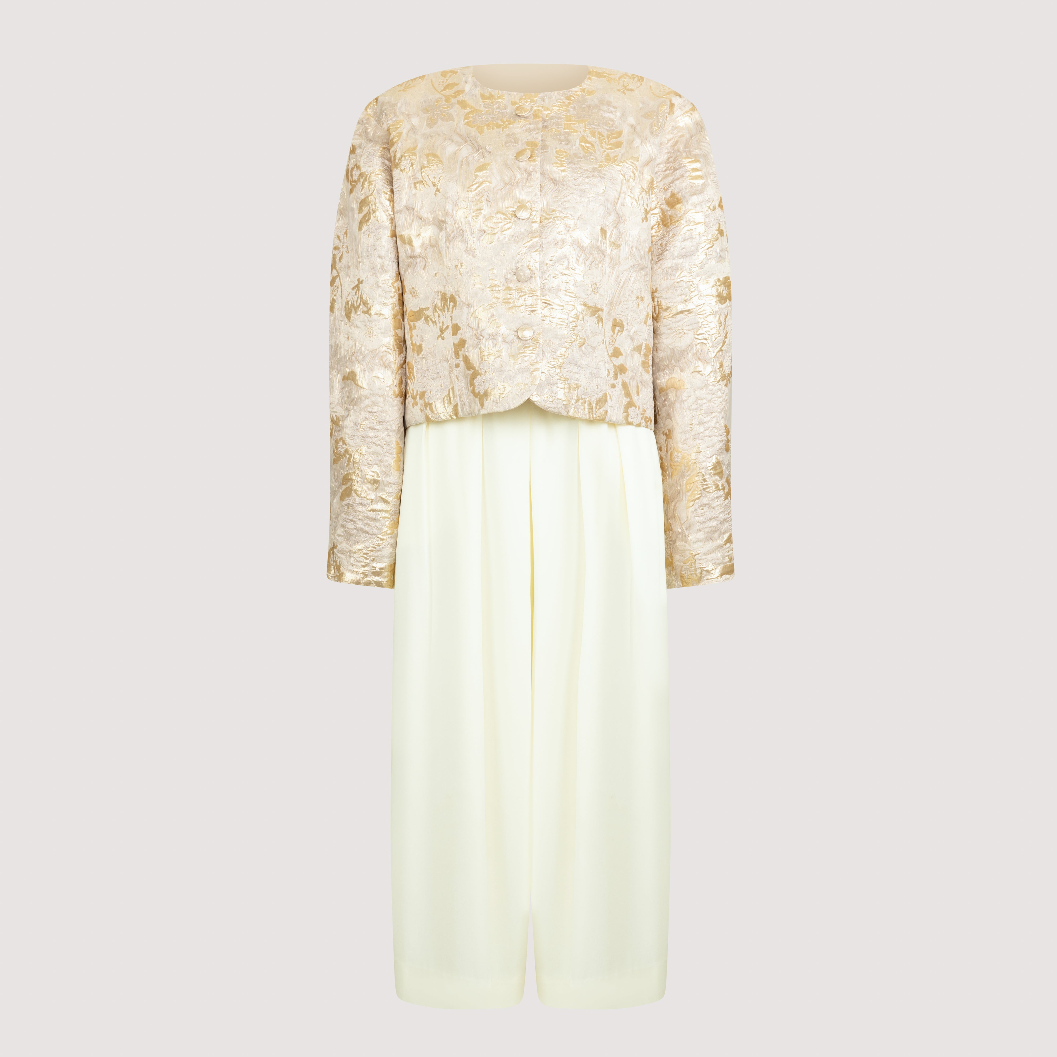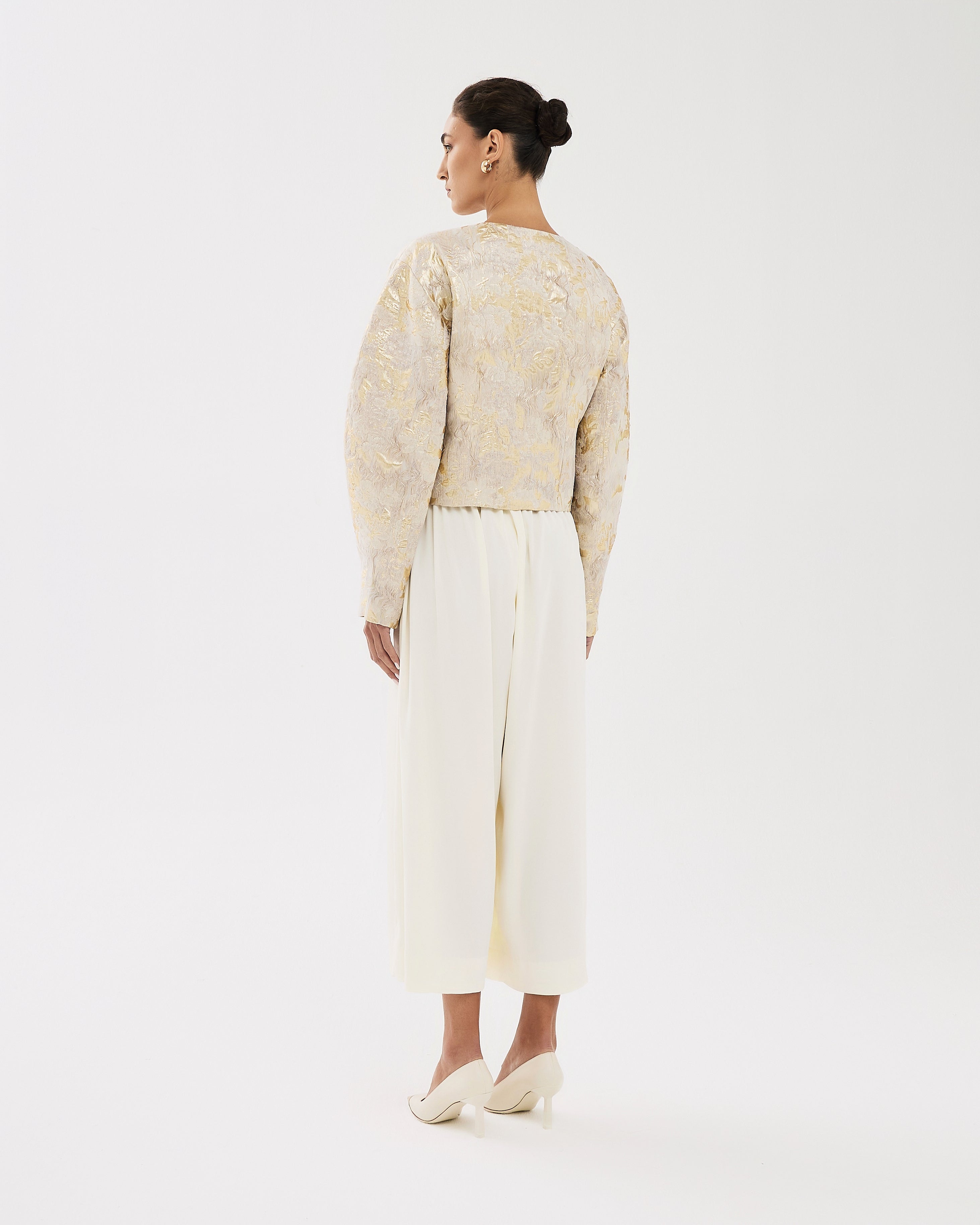 This off-white set pairs a structured brocade jacket with shimmering patterns and wide-leg crepe pants, blending elegance, texture, and a graceful silhouette.