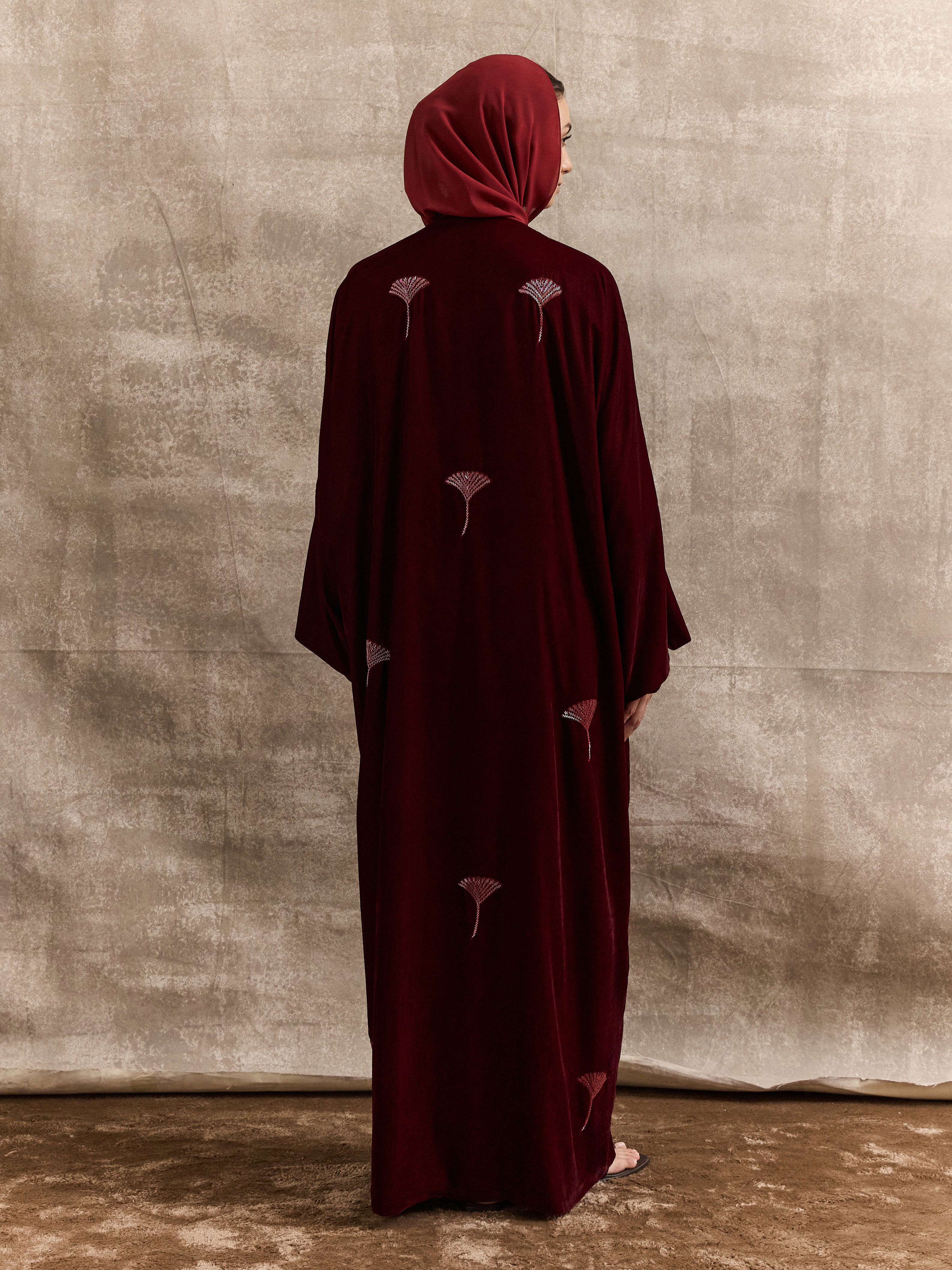 A loose-fit velvet abaya in a rich maroon hue, adorned with a subtle print and flowing silhouette for an elegant and refined look.
