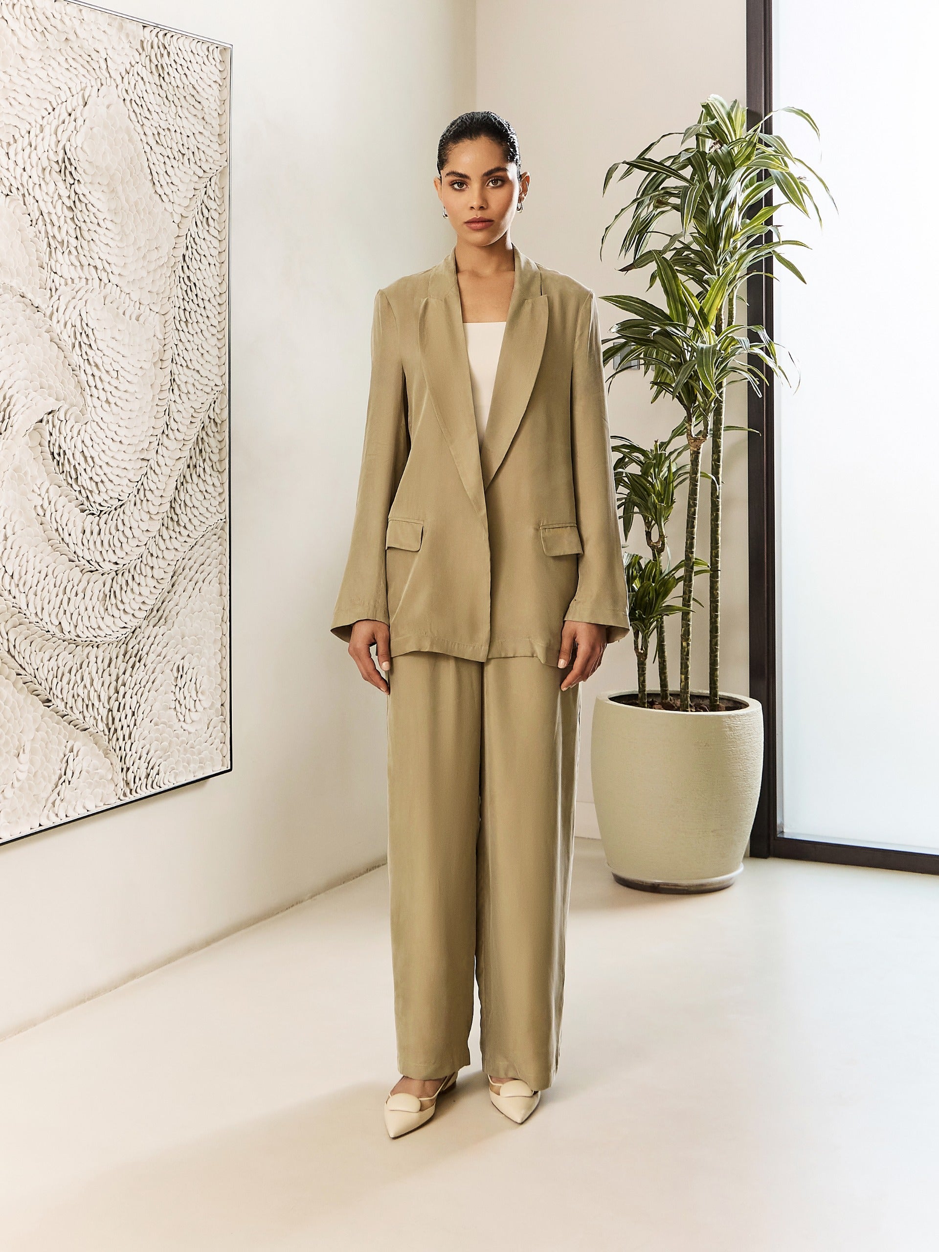Cupro fabric suit featuring a relaxed open-front blazer and loose straightleg pants.