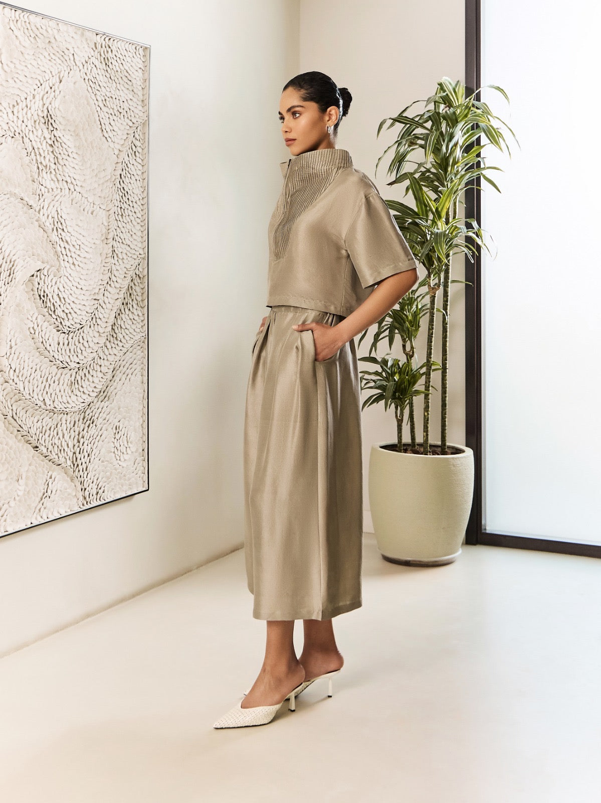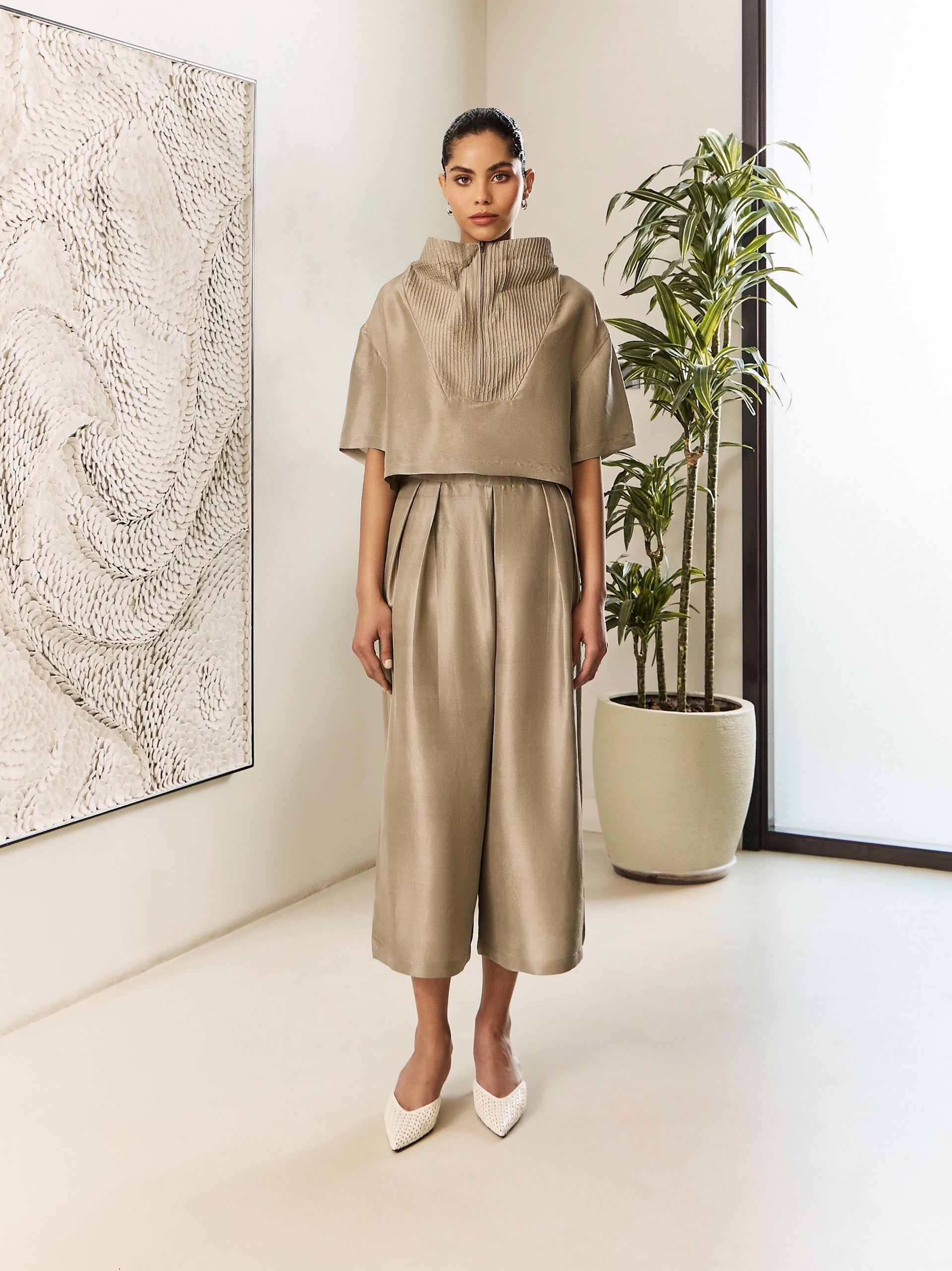 Modern co-ord set in 100% sericin silk, featuring a structured high-collar top with pintuck detailing and fluid culotte pants.