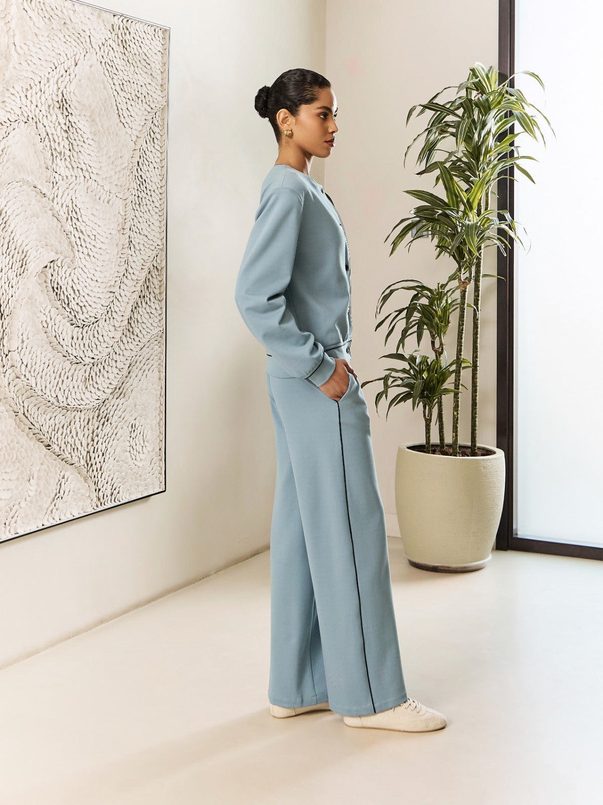 Bomber jacket set in soft, stretchy fabric featuring a snap-button jacket and wide-leg pants for a sporty yet refined look.