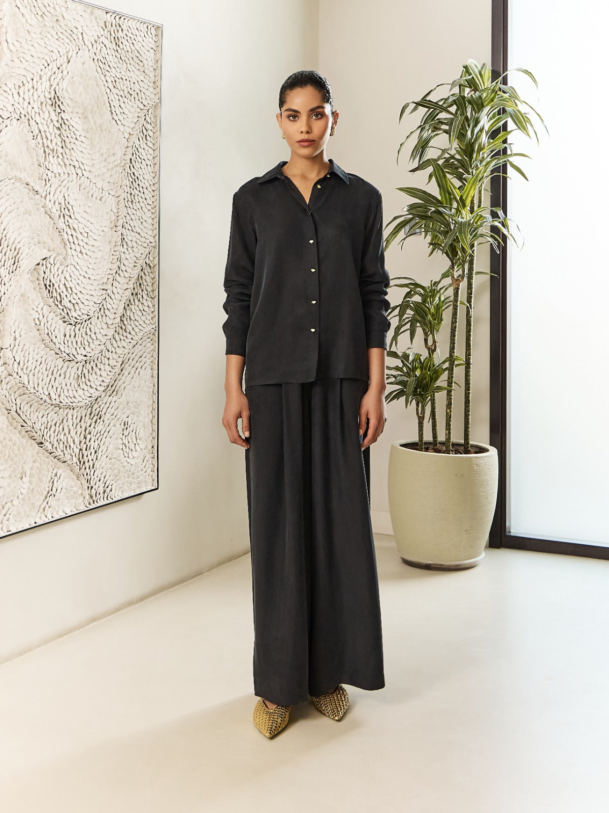 Button-down shirt crafted from smooth, breathable cupro fabric, featuring a relaxed fit, subtle sheen, and wide-leg silhouette.