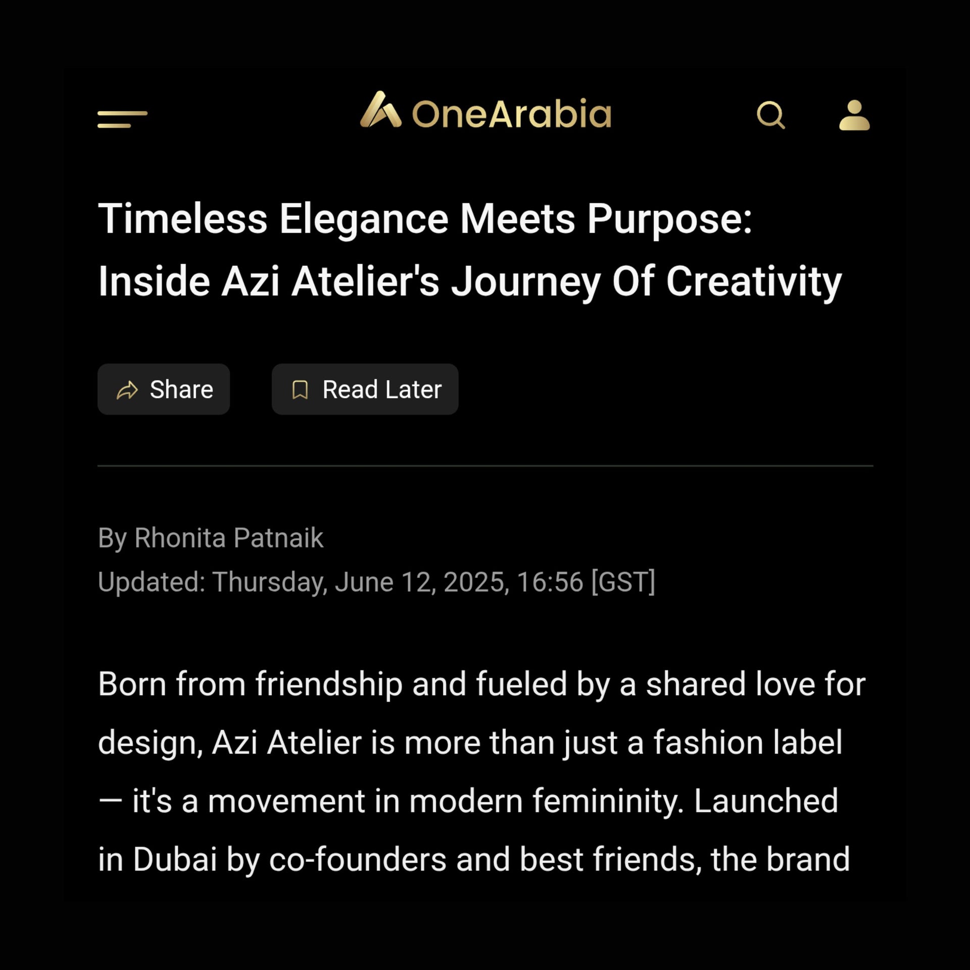 AZI Atelier, founded in Dubai by two ambitious best friends, is more than a fashion label, it’s a movement rooted in optimism, strength, and individuality. We craft timeless, sophisticated designs that honor every woman's uniqueness, encouraging boldness, beauty, and purpose.